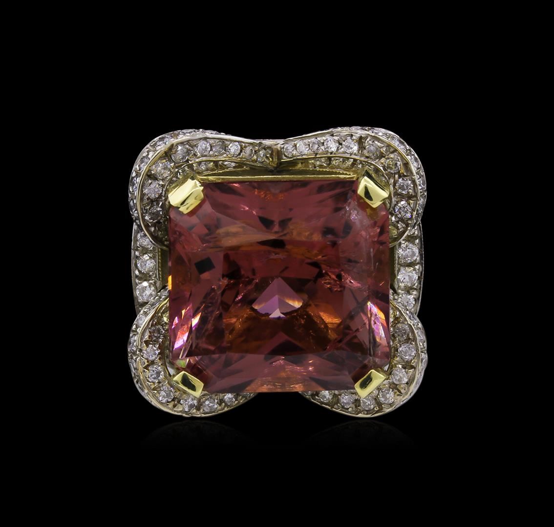 One 18KT White and Yellow Gold Lady's Ring. 20.27 GR. APPROX. Containing: one center emerald cut natural pink tourmaline. TW: 20.97cts. Approx TW: 1.50 cts round brilliant cut diamonds. All VS-SI Clarity, G-H Color. Fine Cutting and Proportions. RBGS Appraised at $30,000.00.