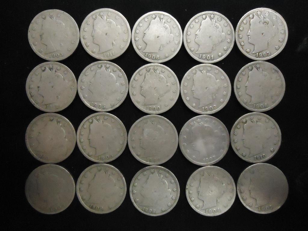 20 ASSORTED 1900'S LIBERTY "V" NICKELS