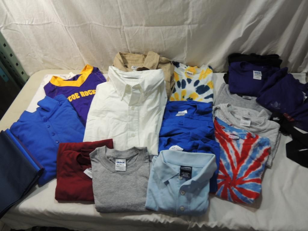 ASSORTED PLAIN TSHIRTS VARIOUS SIZES POLO SHIRTS AND BOTTON DOWN DRESS SHIRTS. DIFFERENT COLORS. AS SHOWN SEE PHOTO FOR MORE DETAILS.