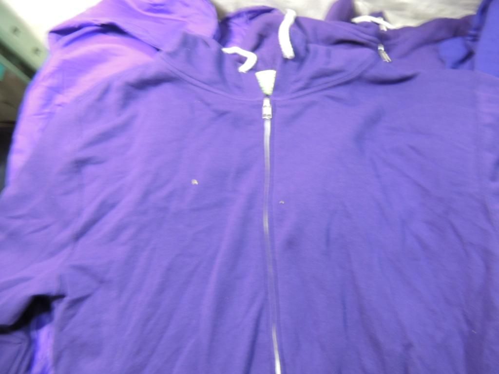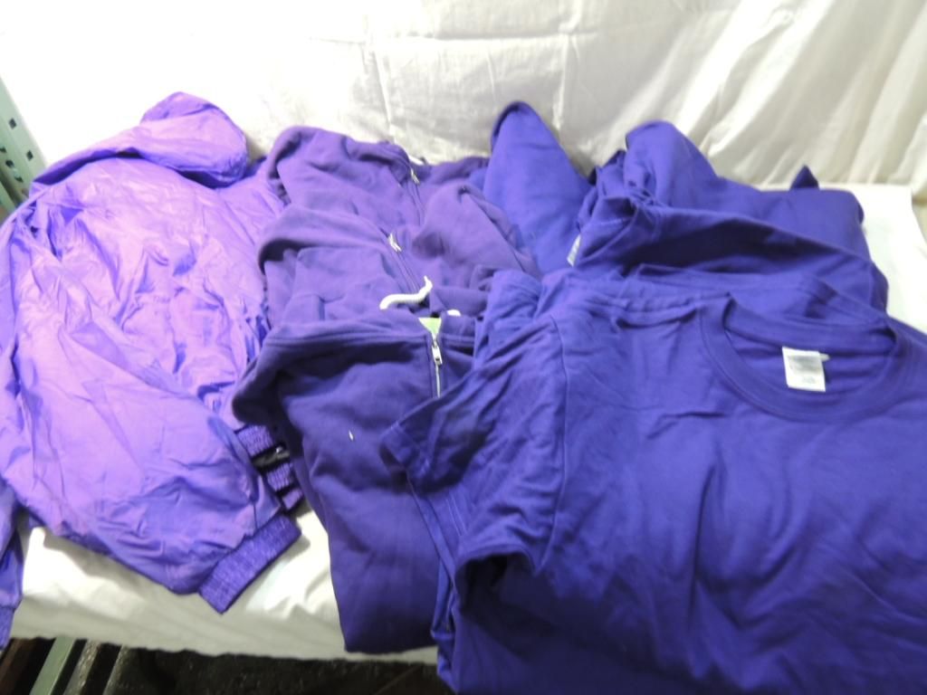ASSORTED SIZES ALL PURPLE. ZIP UP HOODIES. ZIP UP WIND BREAKER JACKETS. SWEATSHIRTS AND TSHIRTS. GREAT SCHOOL COLORS. AS SHOWN SEE PHOTO FOR MORE DETAILS.