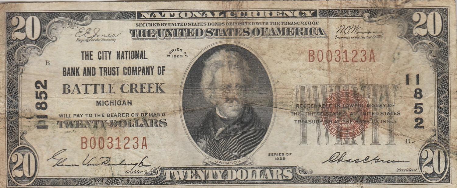 $20 BATTLE CREEK MICH NATIONAL NOTE 1929 CH 11852