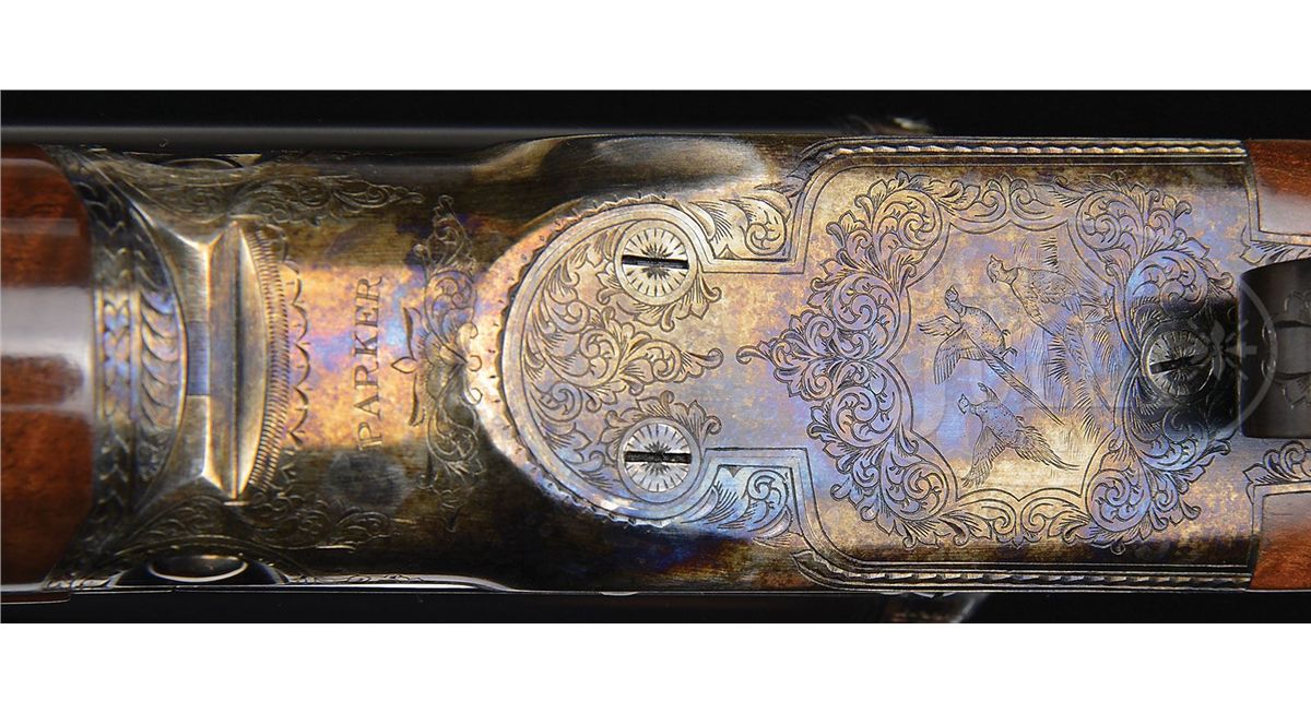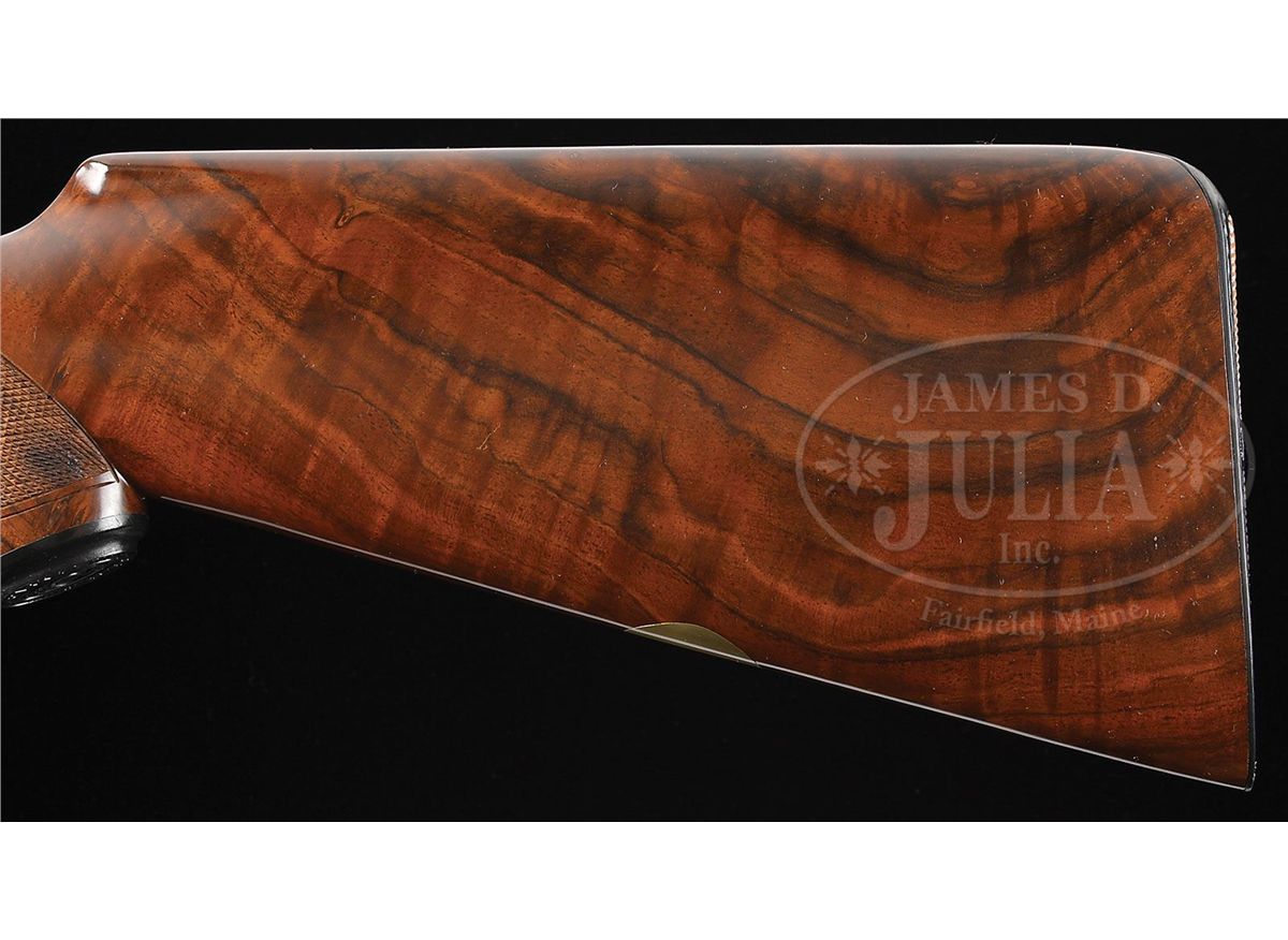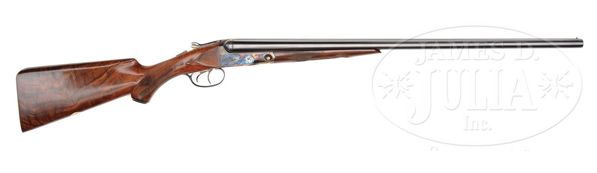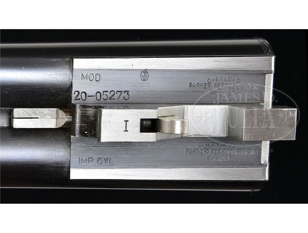 SN 20-05273. Cal. 20 ga. 2-3/4" Chambers. 0 Frame. 26" Bbls are marked with Winchester reproduction nomenclature on left bbl, and "Made in Japan" on right. Typical case hardened action features automatic safety and double triggers. Strikingly figured and marbled claro walnut capped pistol grip buttstock measures 14-1/2" over skeleton buttplate, and has large gold oval on toe line. Splinter ejector forend has typical metal tip and Parker release. Bore diameter: left-.617, right -.617. Bore restrictions: left -.016 (Mod), right -.009 (IC). Wall thickness: left -.032, right -.032. Drop at heel: 2", drop at comb: 1-5/16". Weight: 6 lbs. 7 oz. LOP: 14-1/2". CONDITION: Excellent, near new, retaining essentially all of its orig finishes on wood and metal, with only a hint of silvering on forend latch. One or two minor pings are in wood finish. Mechanically crisp. 4-49267 MGM105