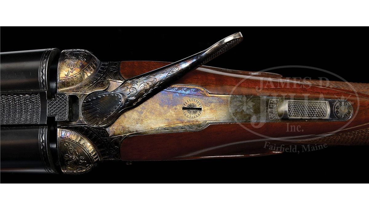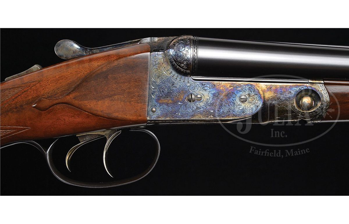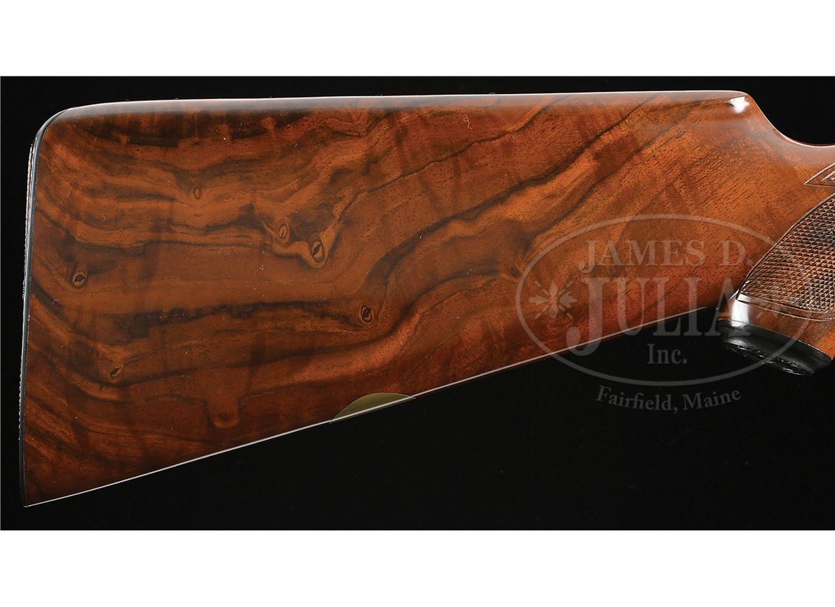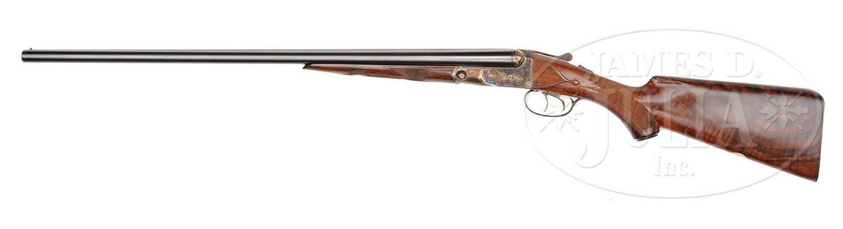 SN 20-05273. Cal. 20 ga. 2-3/4" Chambers. 0 Frame. 26" Bbls are marked with Winchester reproduction nomenclature on left bbl, and "Made in Japan" on right. Typical case hardened action features automatic safety and double triggers. Strikingly figured and marbled claro walnut capped pistol grip buttstock measures 14-1/2" over skeleton buttplate, and has large gold oval on toe line. Splinter ejector forend has typical metal tip and Parker release. Bore diameter: left-.617, right -.617. Bore restrictions: left -.016 (Mod), right -.009 (IC). Wall thickness: left -.032, right -.032. Drop at heel: 2", drop at comb: 1-5/16". Weight: 6 lbs. 7 oz. LOP: 14-1/2". CONDITION: Excellent, near new, retaining essentially all of its orig finishes on wood and metal, with only a hint of silvering on forend latch. One or two minor pings are in wood finish. Mechanically crisp. 4-49267 MGM105