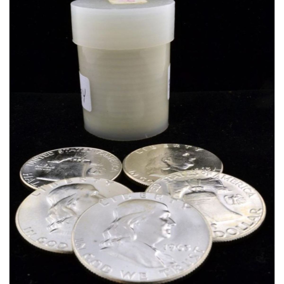 The Franklin half dollar is a coin that was struck by the United States Mint from 1948 to 1963. The fifty-cent piece pictures Founding Father Benjamin Franklin on the obverse and the Liberty Bell on the reverse. A smalleagle was placed to the right of the bell to fulfill the legal requirement that half dollars depict the figure of an eagle. Produced in 90 percent silver with a reeded edge, the coin was struck atthePhiladelphia, Denver, and San Francisco mints.