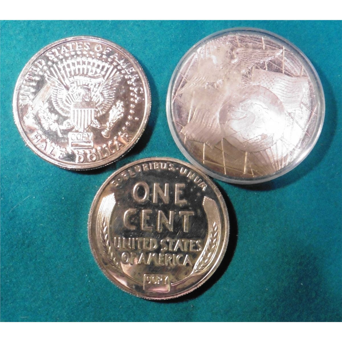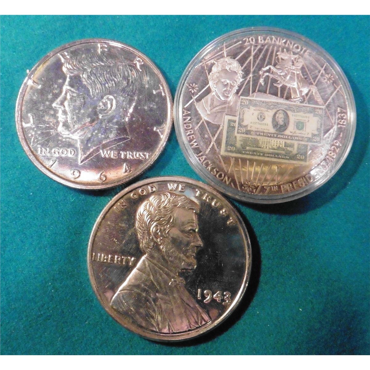 “20 Bank note Andrew Jackson 7th President 1829-1837”, Eagle, flags, and Globe reverse. 50Mm, Portrait note embossing, encapsulated; 1964 Large Size Copy of a Kennedy Half Dollar; & a large size copy of a 1943 P U.S. Steel Cent.