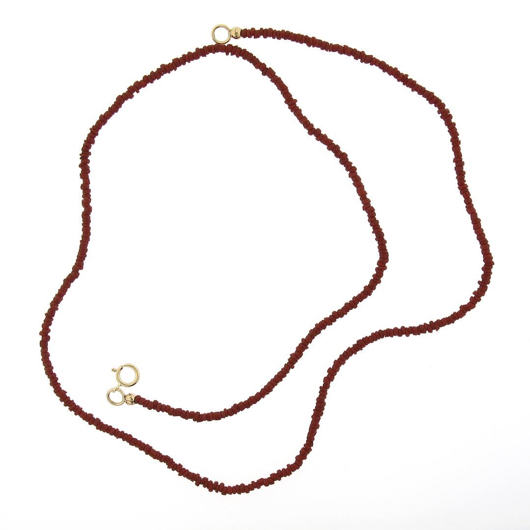 A numerous of tumbled natural coral strand necklace with 14k yellow gold ends and clasp.  It weighs a total of 3.54 grams, measures 2.6mm wide, and measures 20 inches in length.
