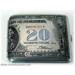 <TABLE cellSpacing=0 cellPadding=0 width="100%" bgColor=#000000 border=0><TBODY> <TR><TD width="100%"><TABLE cellSpacing=1 cellPadding=3 width="100%" border=0><TBODY><TR><TD width="100%" bgColor=#79735c><FONT face=arial color=#ffffff size=3><B>Description</B> </FONT></TD></TR><TR><TD width="100%" bgColor=#ffffff><FONT face=arial size=2><B>$20 Bill Cigarette Case.</B></I> From the same series as the 500 in this sale. The serial number is red, the twenty and some of the text is blue and Washington has a brown tint behind him. $20 is the scarcest denomination for these cases. (150-up ) </FONT></TD></TR></TBODY></TABLE></TD></TR></TBODY></TABLE><BR><TABLE cellSpacing=0 cellPadding=0 width="100%" bgColor=#000000 border=0><TBODY><TR> Important notice: Heritage usually auctions material at the rate of 200-250 lots per hour. On some occasions eBay Live bid software or the Internet may not be able to keep up with the pace of the auction. We recommend placing a realistic absentee bid now as insurance to avoid disappointment. Occasionally the auctioneer may eliminate or reject an eBay Live bid, and the auctioneer may also reopen a lot after the close of the eBay live bidding (usually because we missed an audience bid), and may reject your bid even if it shows you as the winning bidder. By bidding via eBay Live, you agree that Heritage may award the lot to another bidder at its sole discretion under the circumstances described above or any other reasonable circumstances. Also please note that all Heritage lots purchased through eBay Live carry a 20% Buyer's Premium. Please make sure you read the Terms and Conditions before you bid.</TR></TBODY></TABLE>