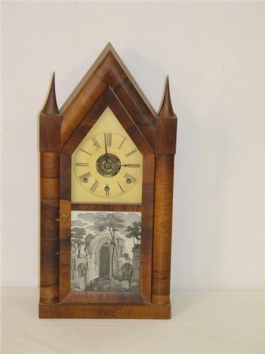 20" CHAUNCEY BOARDMAN MAHOGANY CASED STEEPLE CLOCK W/ REVERSE LOWER TABLET W/ GOTHIC TOMBS - LOSSES & IMPERFECTIONS