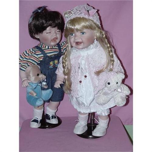 20" CRY BABIES PORCELAIN TODDLER TWINS, MINT. Wonderful pair of cry baby kids, girl with blonde pigtails and blue eyes, boy with short brown bob. They are porcelain head, arms, and legs, and cloth weighted bodies. They are dressed boy with brown jumper and striped T and girl with white cotton dress, pink sweater and matching hat. They both carry a small pet animal. This is a lovely pair in mint condition and comes in their original boxes with certificates.