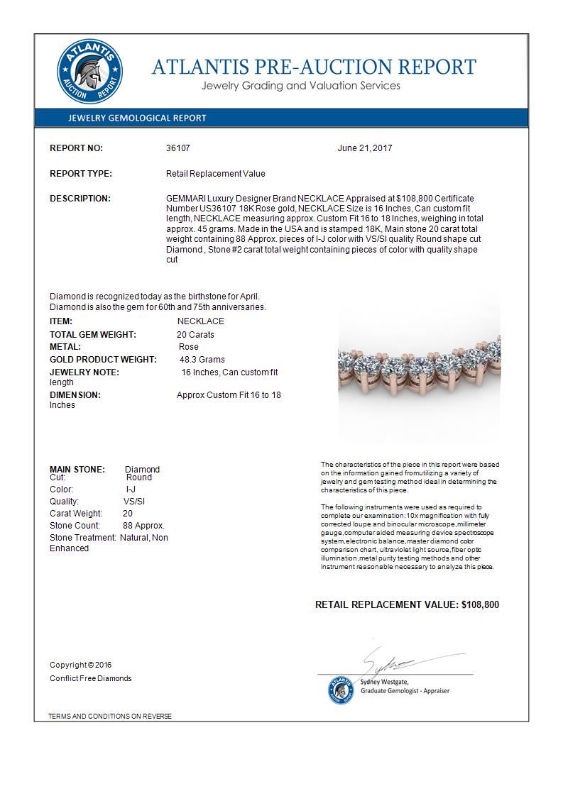 20 CTW Solitaire VS/SI Diamond Necklace 18K Rose Gold ---- Luxury Designer Brand NECKLACE Appraised Retail Price at $108,800 ---- SKU Number US36107 18K Rose gold NECKLACE Size is 16 Inches, Can custom fit length, NECKLACE measuring approx. Custom Fit 16 to 18 Inches, weighing in total approx. 45 grams. Made in the USA and is stamped 18K, Main stone 20 carat total weight containing 88 Approx. pieces of I-J color with VS/SI quality Round shape cut Diamond , Stone #2 carat total weight containing pieces of color with quality shape cut