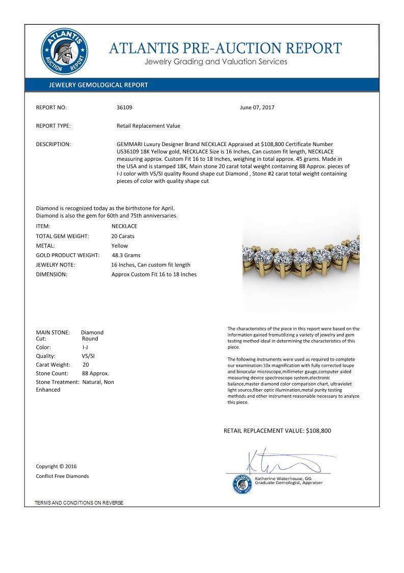 20 CTW Solitaire VS/SI Diamond Necklace 18K Yellow Gold ---- Luxury Designer Brand NECKLACE Appraised Retail Price at $108,800 ---- SKU Number US36109 18K Yellow gold NECKLACE Size is 16 Inches, Can custom fit length, NECKLACE measuring approx. Custom Fit 16 to 18 Inches, weighing in total approx. 45 grams. Made in the USA and is stamped 18K, Main stone 20 carat total weight containing 88 Approx. pieces of I-J color with VS/SI quality Round shape cut Diamond , Stone #2 carat total weight containing pieces of color with quality shape cut