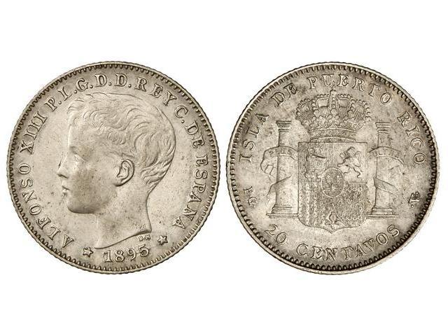 20 Centavos de Peso. 1895. PUERTO RICO. PG-V. (Rayas en reverso). MBC+/MBC.