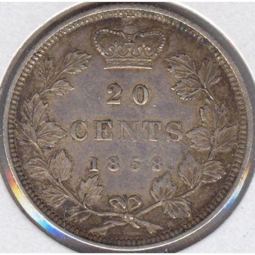 20 Cents 1858, grade EF-40, with typical weak 5 in date, Coinage. Nice example.