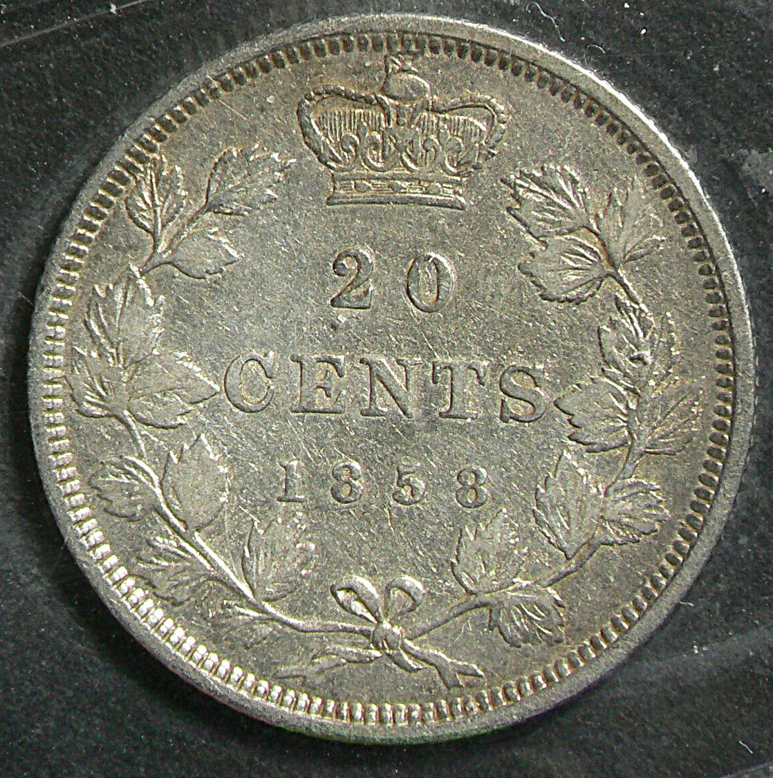 20 Cents 1858, graded ICCS VF-30. Not noted Re-engraved 5.