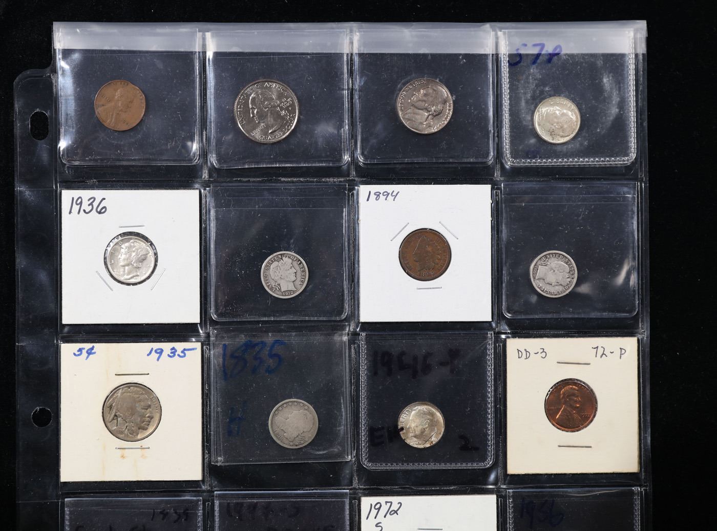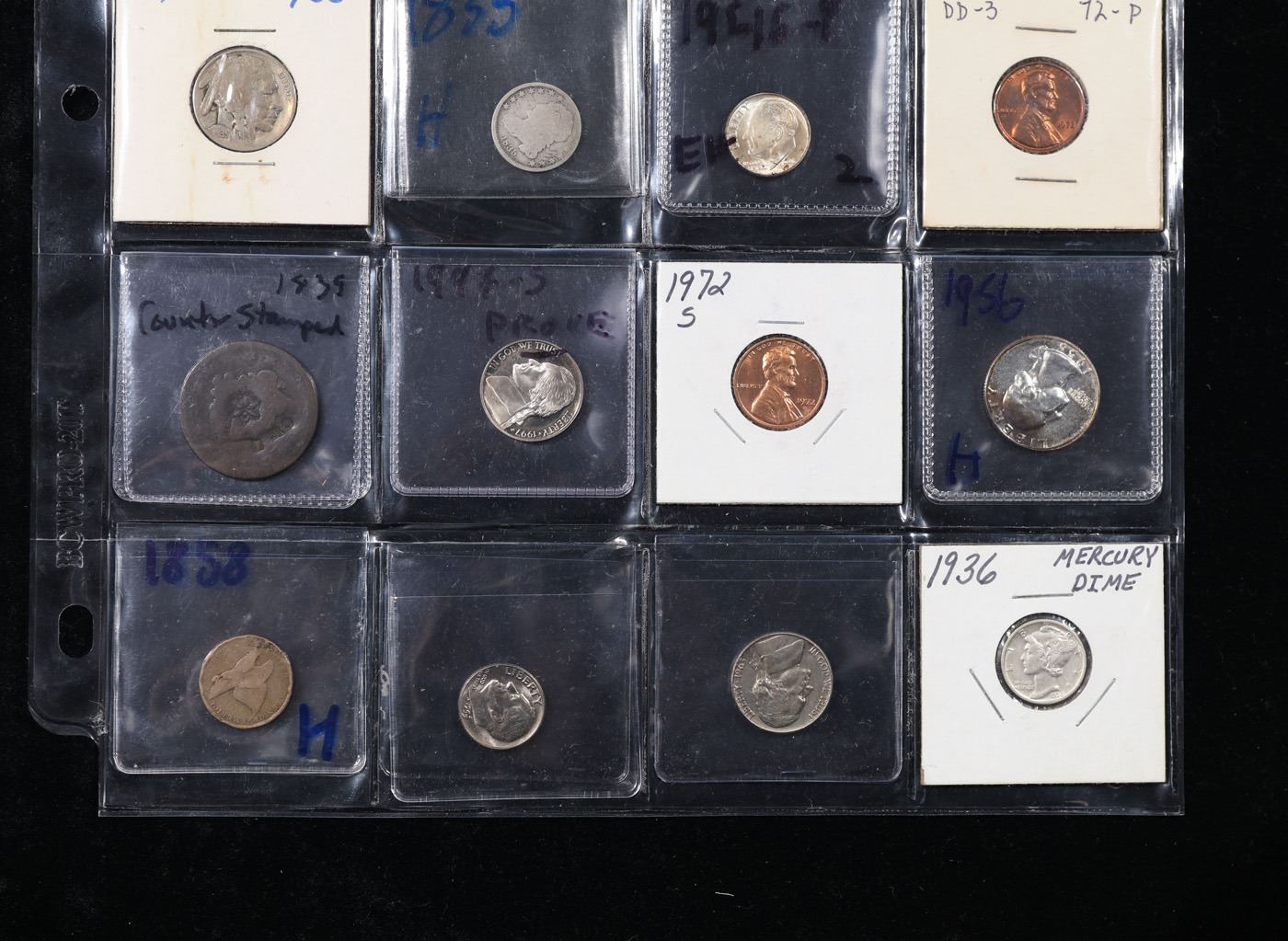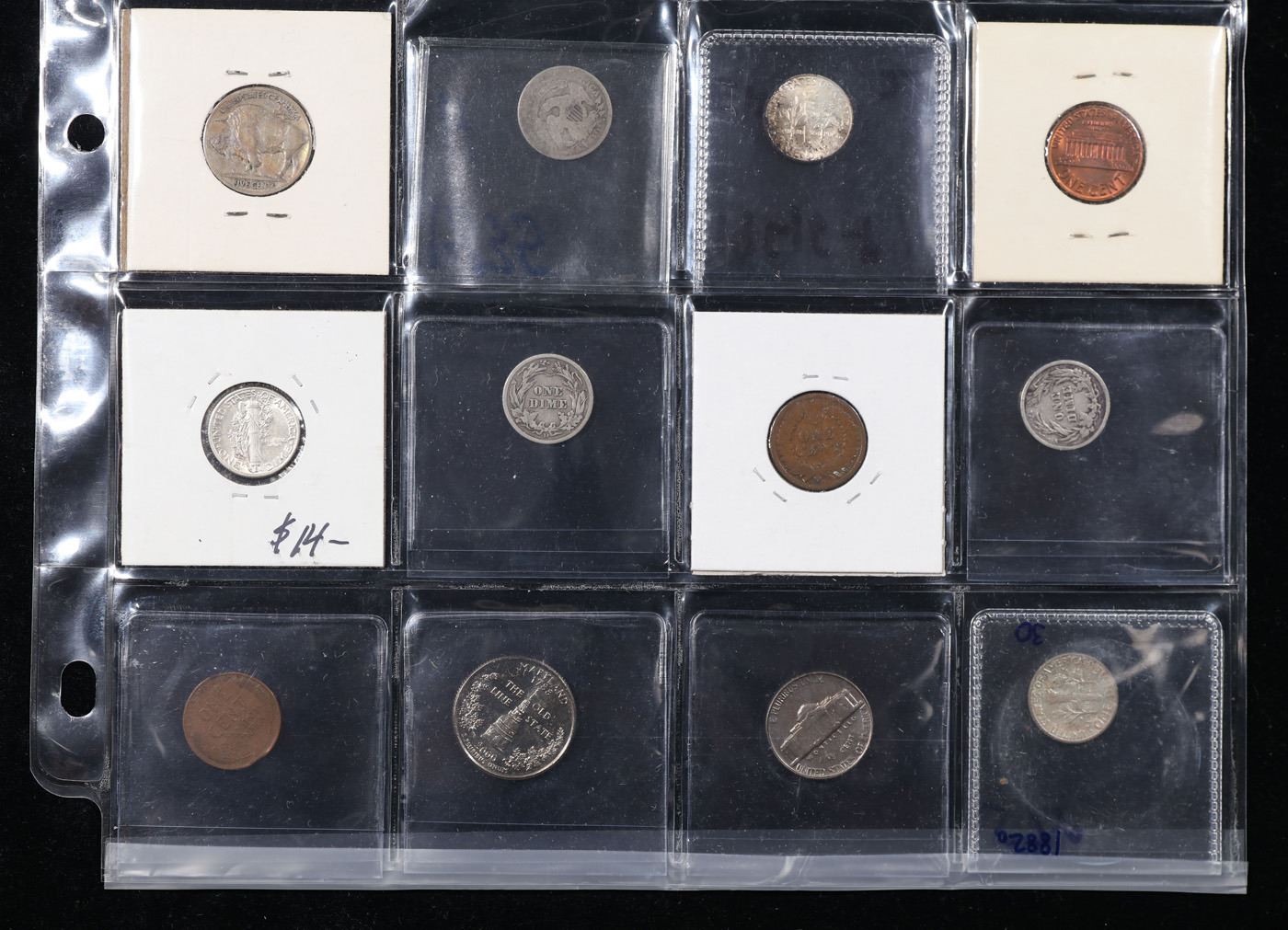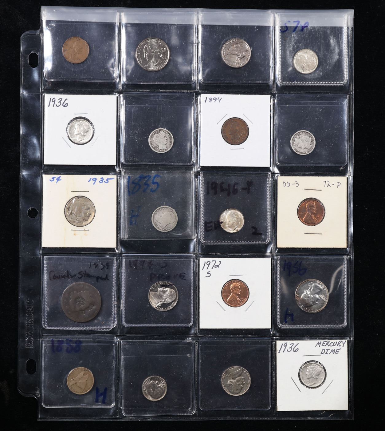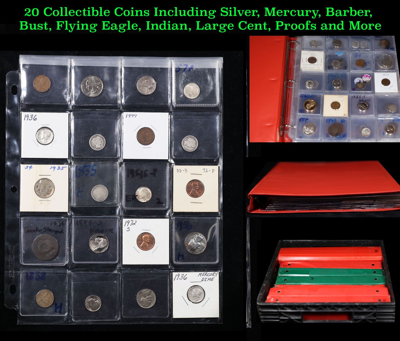 20 Collectible Coins Including Silver, Mercury, Barber, Bust, Flying Eagle, Indian, Large Cent, Proofs and More!. We have received a huge collection of over 10 thousand US coins in flips, 2x2 holders, and 20 coin pages. We are forced, due to limited lots, to sell this collection in pages of 20 coins. All of the pages include Silver Coins. Most contain Indian Cents, Proof Coins, Barber Coinage, Bust Coinage, Lincoln Cents, Flying Eagles, Jefferson Nickels, Roosevelt Dimes, Buffalo Nickels, Eisenhower Dollars, Kennedy Halves, Large Cents including some Draped Bust Large Cents, Mercury Dimes, and Liberty V Nickels. These pages could not be reviewed by anyone in our office due to time constraints. We estimate the value of each page to meet or exceed $400 in value! Good luck and happy hunting.