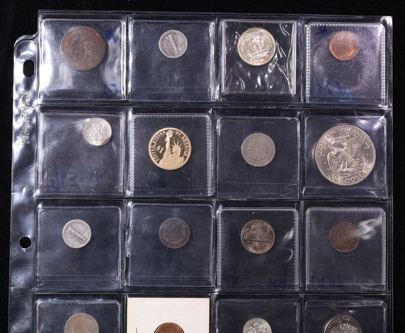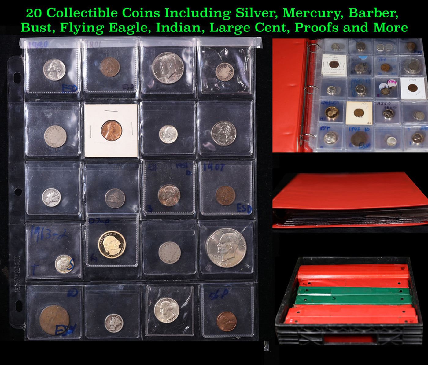 20 Collectible Coins Including Silver, Mercury, Barber, Bust, Flying Eagle, Indian, Large Cent, Proofs and More!. We have received a huge collection of over 10 thousand US coins in flips, 2x2 holders, and 20 coin pages. We are forced, due to limited lots, to sell this collection in pages of 20 coins. All of the pages include Silver Coins. Most contain Indian Cents, Proof Coins, Barber Coinage, Bust Coinage, Lincoln Cents, Flying Eagles, Jefferson Nickels, Roosevelt Dimes, Buffalo Nickels, Eisenhower Dollars, Kennedy Halves, Large Cents including some Draped Bust Large Cents, Mercury Dimes, and Liberty V Nickels. These pages could not be reviewed by anyone in our office due to time constraints. We estimate the value of each page to meet or exceed $400 in value! Good luck and happy hunting.
