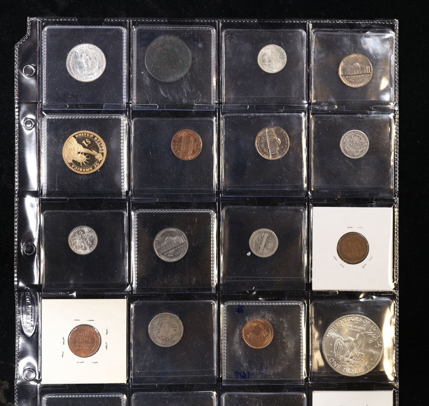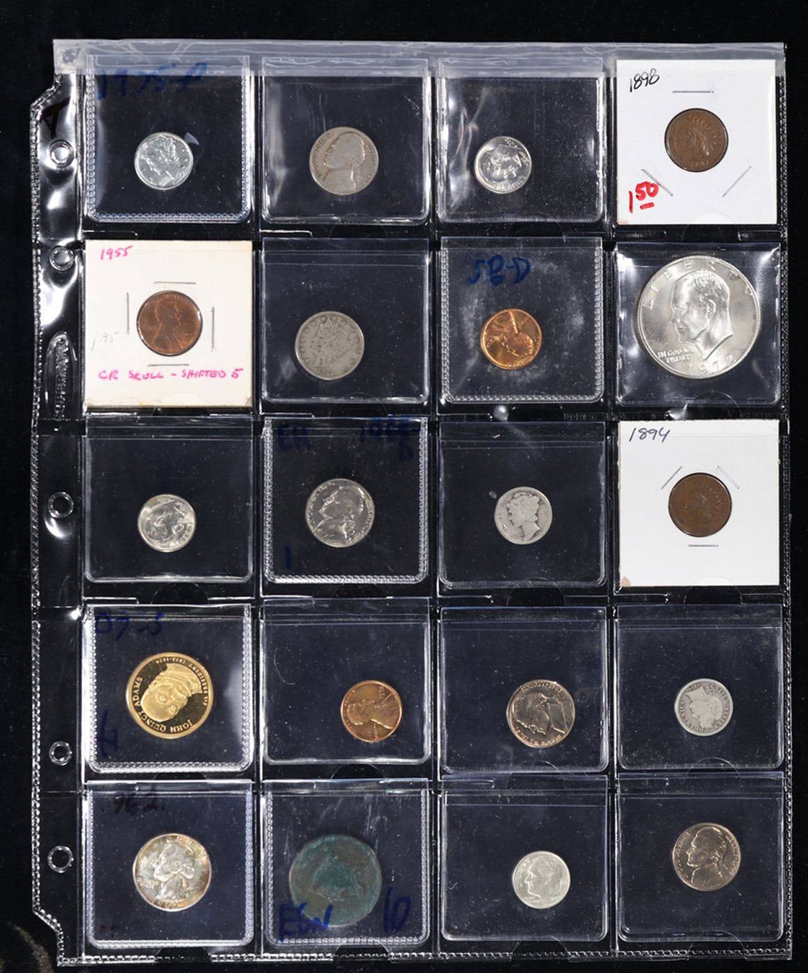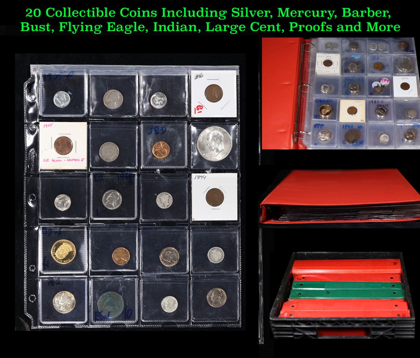 20 Collectible Coins Including Silver, Mercury, Barber, Bust, Flying Eagle, Indian, Large Cent, Proofs and More!. We have received a huge collection of over 10 thousand US coins in flips, 2x2 holders, and 20 coin pages. We are forced, due to limited lots, to sell this collection in pages of 20 coins. All of the pages include Silver Coins. Most contain Indian Cents, Proof Coins, Barber Coinage, Bust Coinage, Lincoln Cents, Flying Eagles, Jefferson Nickels, Roosevelt Dimes, Buffalo Nickels, Eisenhower Dollars, Kennedy Halves, Large Cents including some Draped Bust Large Cents, Mercury Dimes, and Liberty V Nickels. These pages could not be reviewed by anyone in our office due to time constraints. We estimate the value of each page to meet or exceed $400 in value! Good luck and happy hunting.