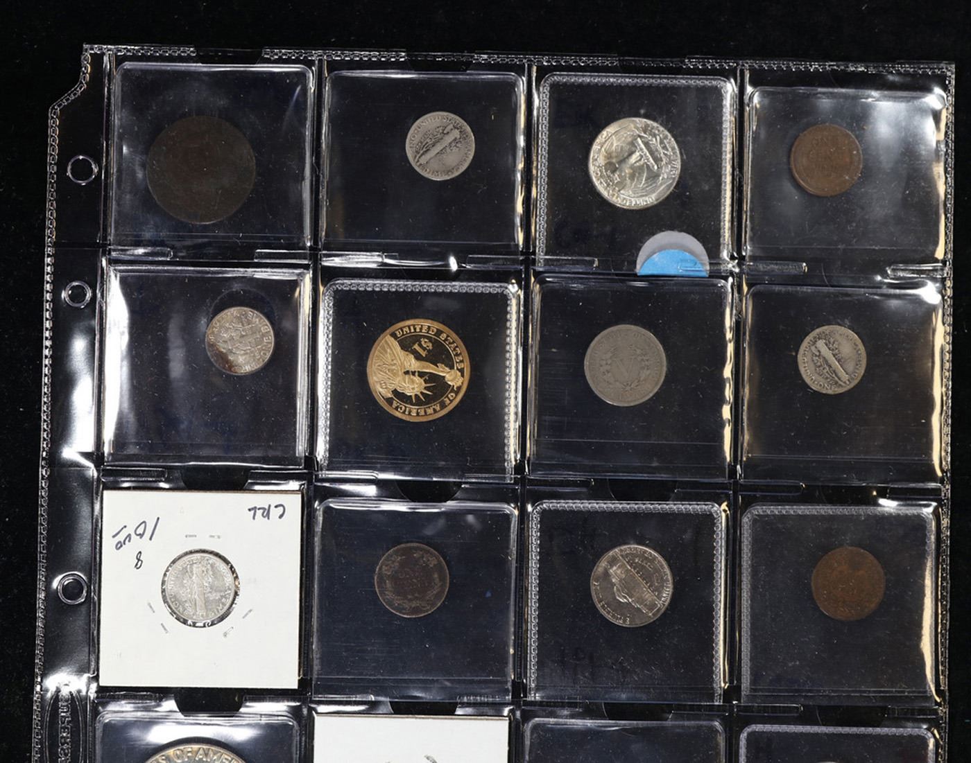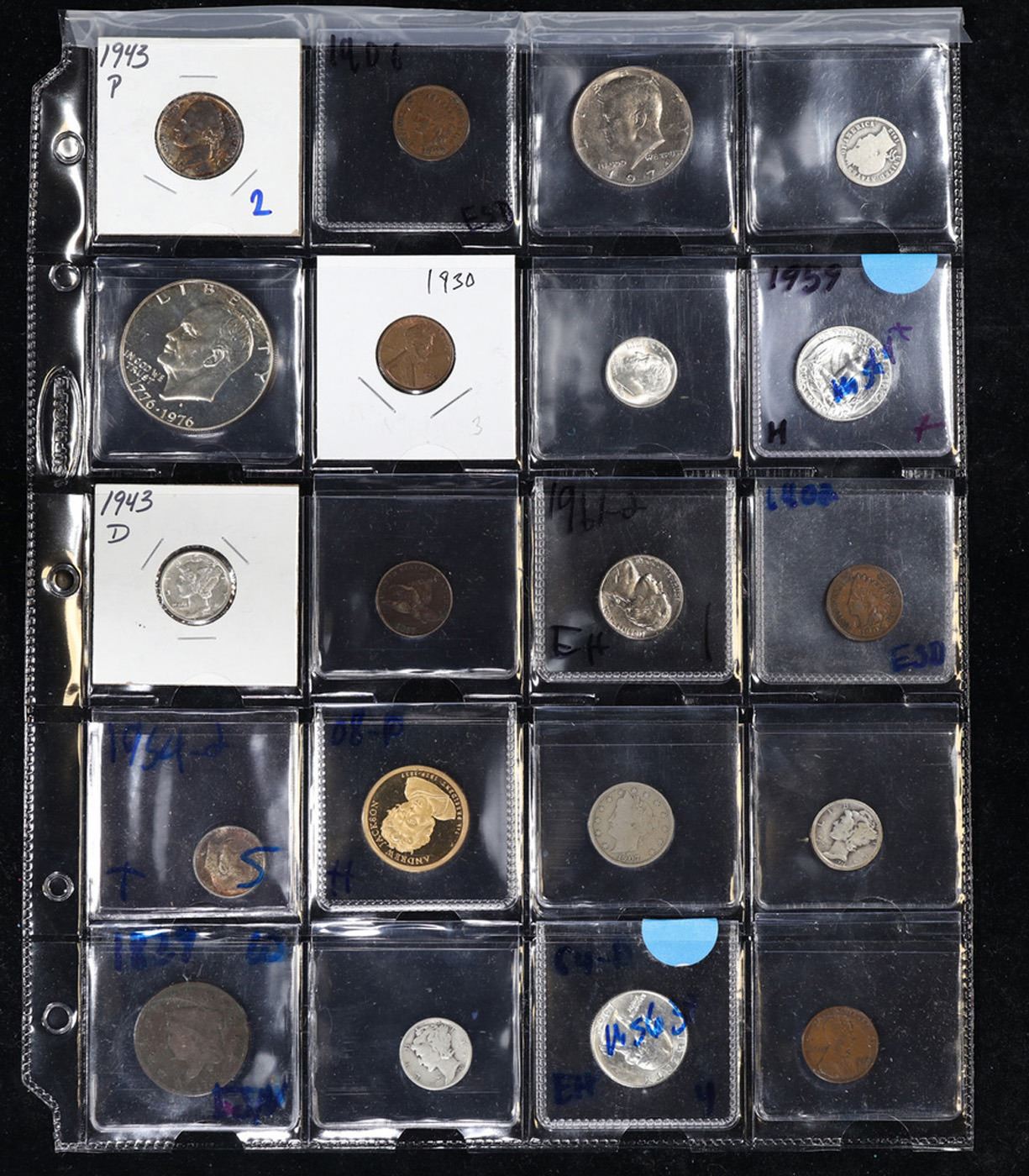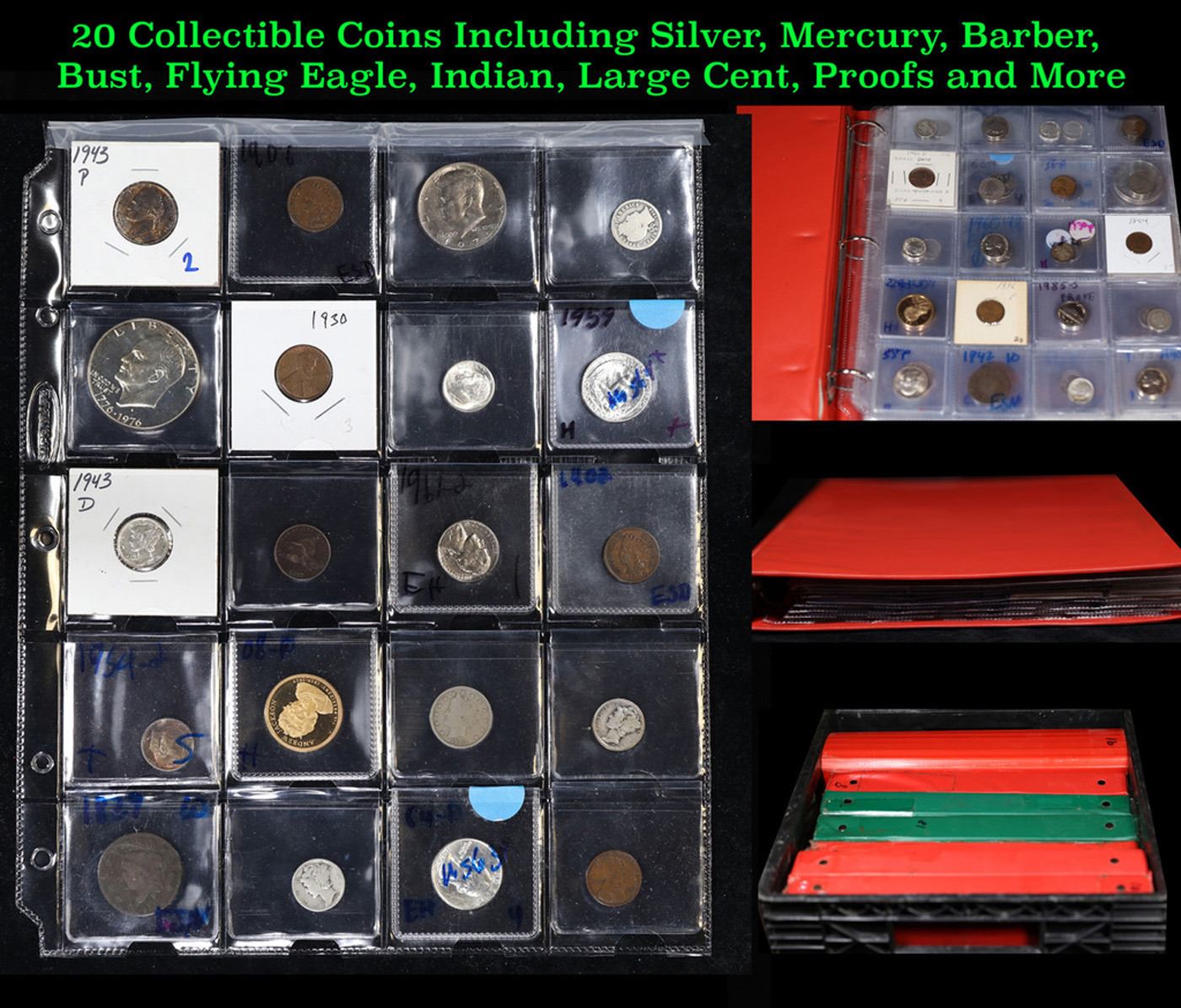 20 Collectible Coins Including Silver, Mercury, Barber, Bust, Flying Eagle, Indian, Large Cent, Proofs and More!. We have received a huge collection of over 10 thousand US coins in flips, 2x2 holders, and 20 coin pages. We are forced, due to limited lots, to sell this collection in pages of 20 coins. All of the pages include Silver Coins. Most contain Indian Cents, Proof Coins, Barber Coinage, Bust Coinage, Lincoln Cents, Flying Eagles, Jefferson Nickels, Roosevelt Dimes, Buffalo Nickels, Eisenhower Dollars, Kennedy Halves, Large Cents including some Draped Bust Large Cents, Mercury Dimes, and Liberty V Nickels. These pages could not be reviewed by anyone in our office due to time constraints. We estimate the value of each page to meet or exceed $400 in value! Good luck and happy hunting.
