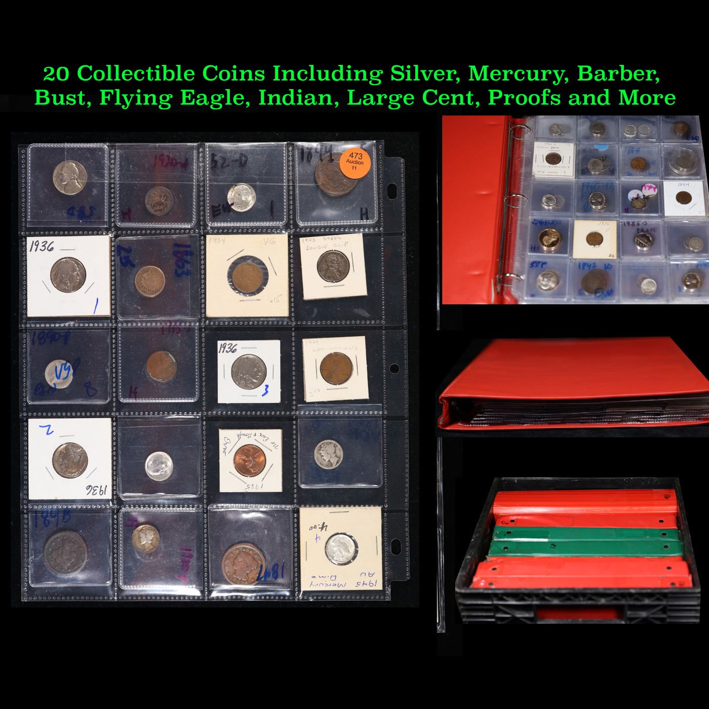 20 Collectible Coins Including Silver, Mercury, Barber, Bust, Flying Eagle, Indian, Large Cent, Proo