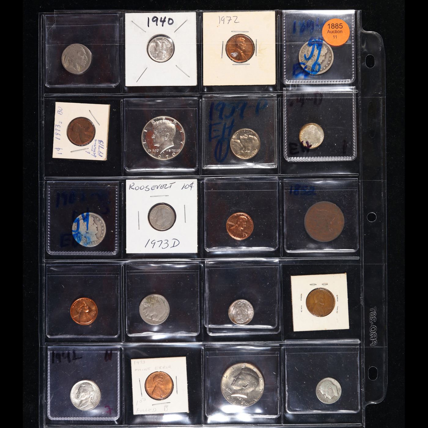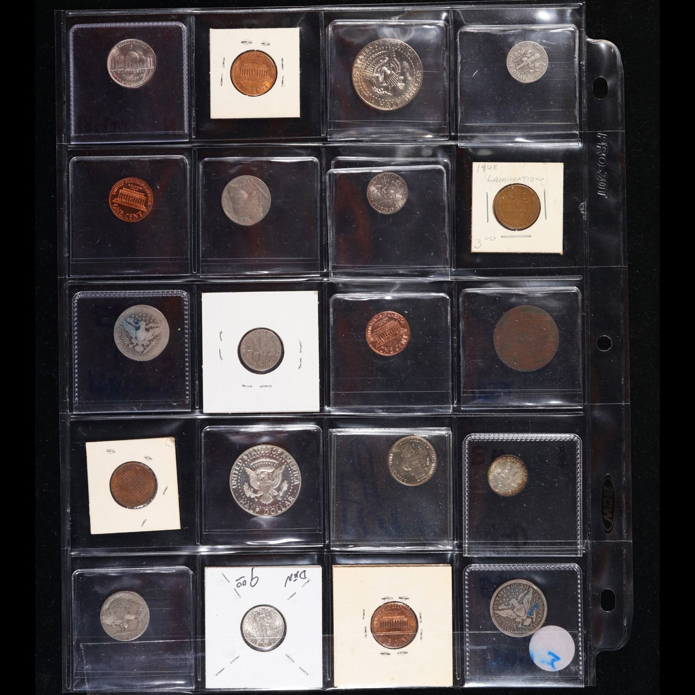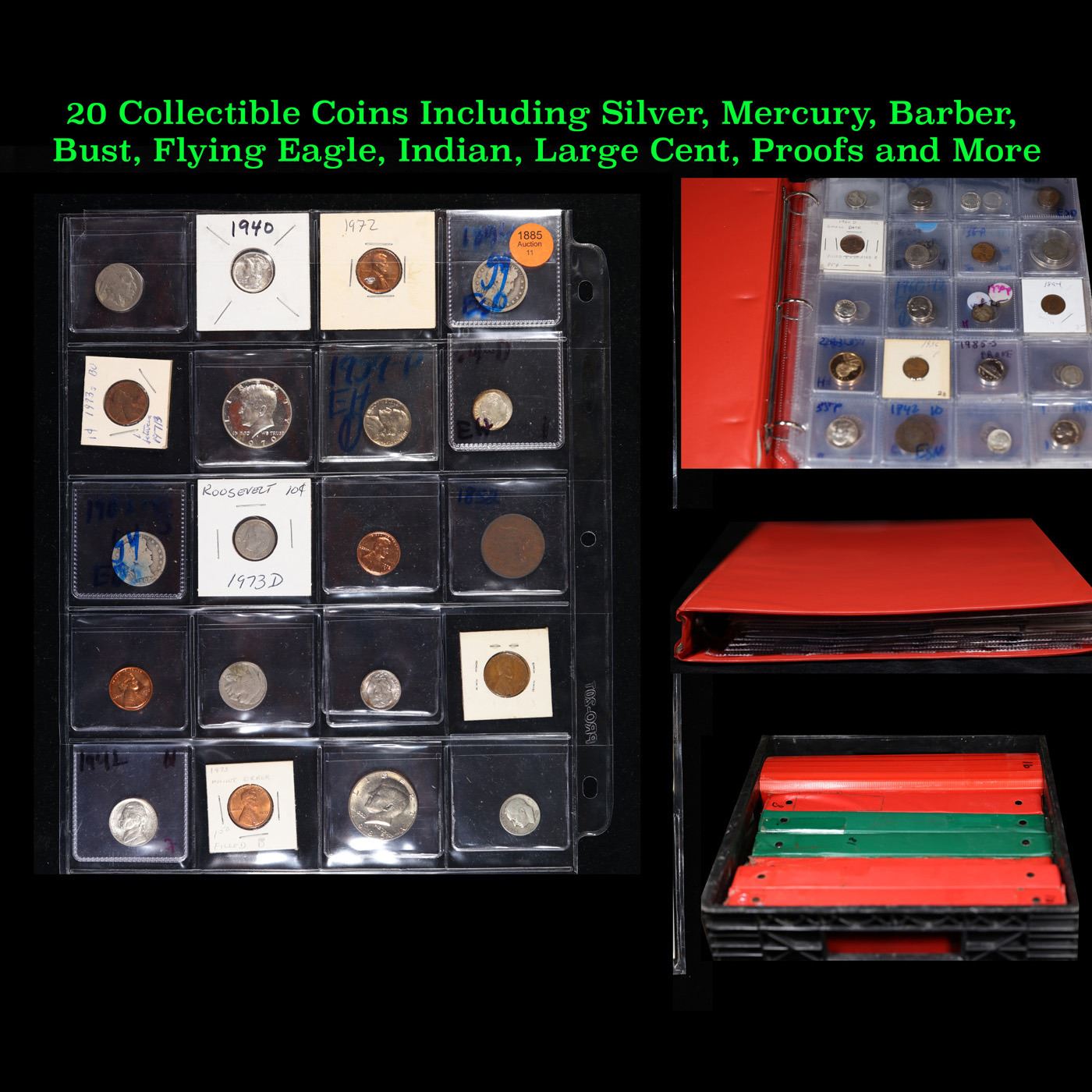 20 Collectible Coins Including Silver, Mercury, Barber, Bust, Flying Eagle, Indian, Large Cent, Proofs and More!. We have received a huge collection of over 10 thousand US coins in flips, 2x2 holders, and 20 coin pages. We are forced, due to limited lots, to sell this collection in pages of 20 coins. All of the pages include Silver Coins. Most contain Indian Cents, Proof Coins, Barber Coinage, Bust Coinage, Lincoln Cents, Flying Eagles, Jefferson Nickels, Roosevelt Dimes, Buffalo Nickels, Eisenhower Dollars, Kennedy Halves, Large Cents including some Draped Bust Large Cents, Mercury Dimes, and Liberty V Nickels. These pages could not be reviewed by anyone in our office due to time constraints. We estimate the value of each page to meet or exceed $200 in value! Good luck and happy hunting.