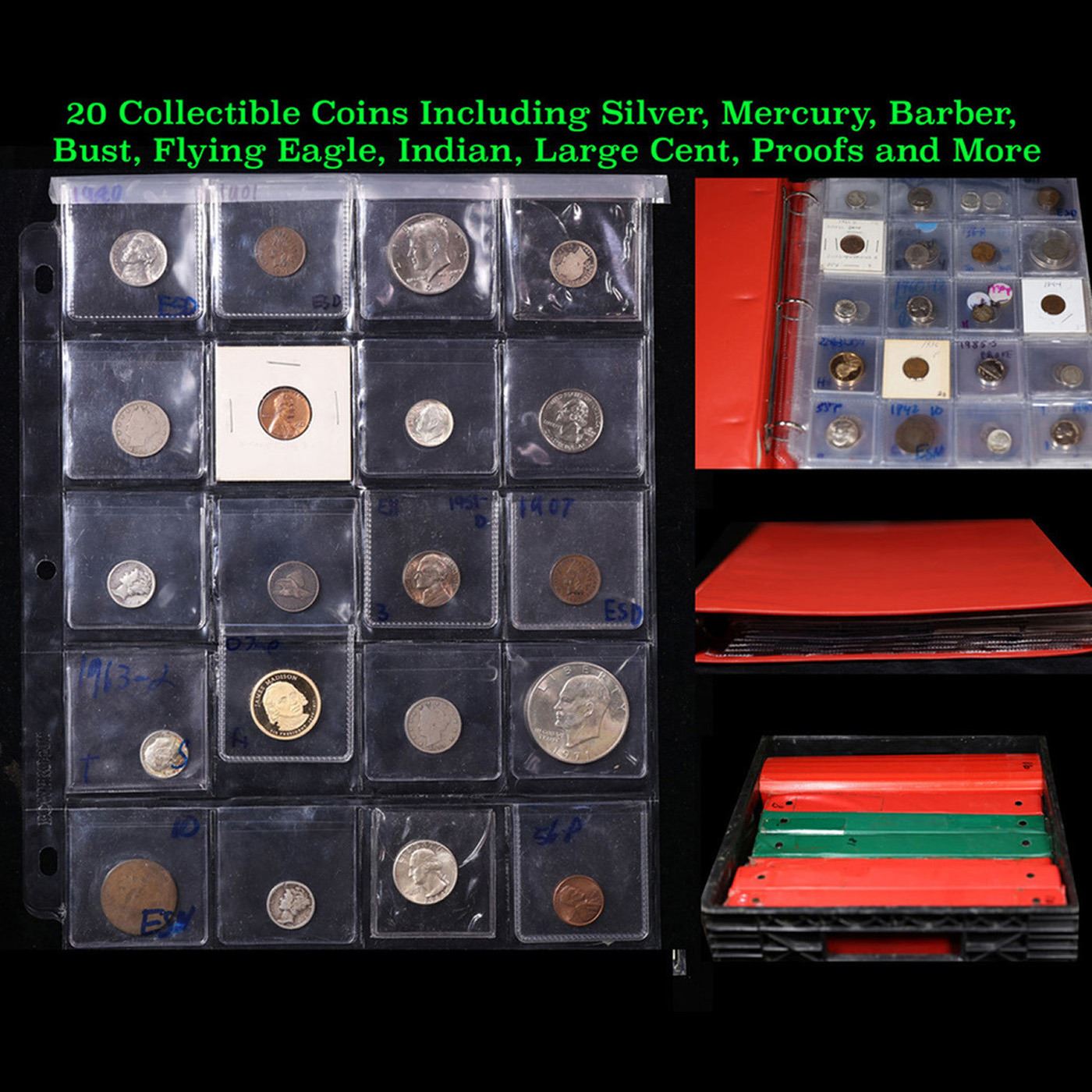 20 Collectible Coins Including Silver, Mercury, Barber, Bust, Flying Eagle, Indian, Large Cent, Proo