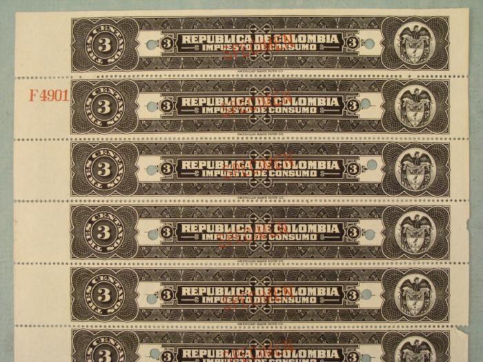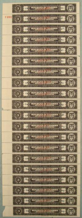 This is a plate block of (20) 3 Centavos tax stamps from Republic De Colombia, marked "IMPUESTO DE CONSUMO." Each has a red "SPECIMEN" overprint and security punch. They are marked "American Bank Note Co." In the upper right corner is a red code number. They have no gum, and are unused, in very good condition, with a few partial separations along the perforated borders.