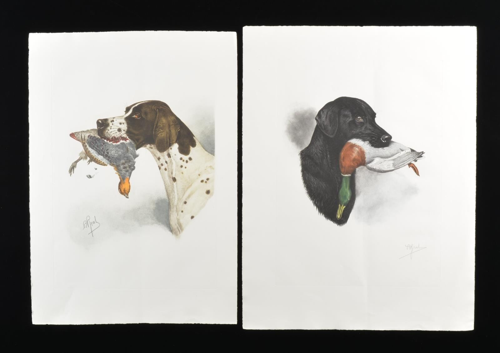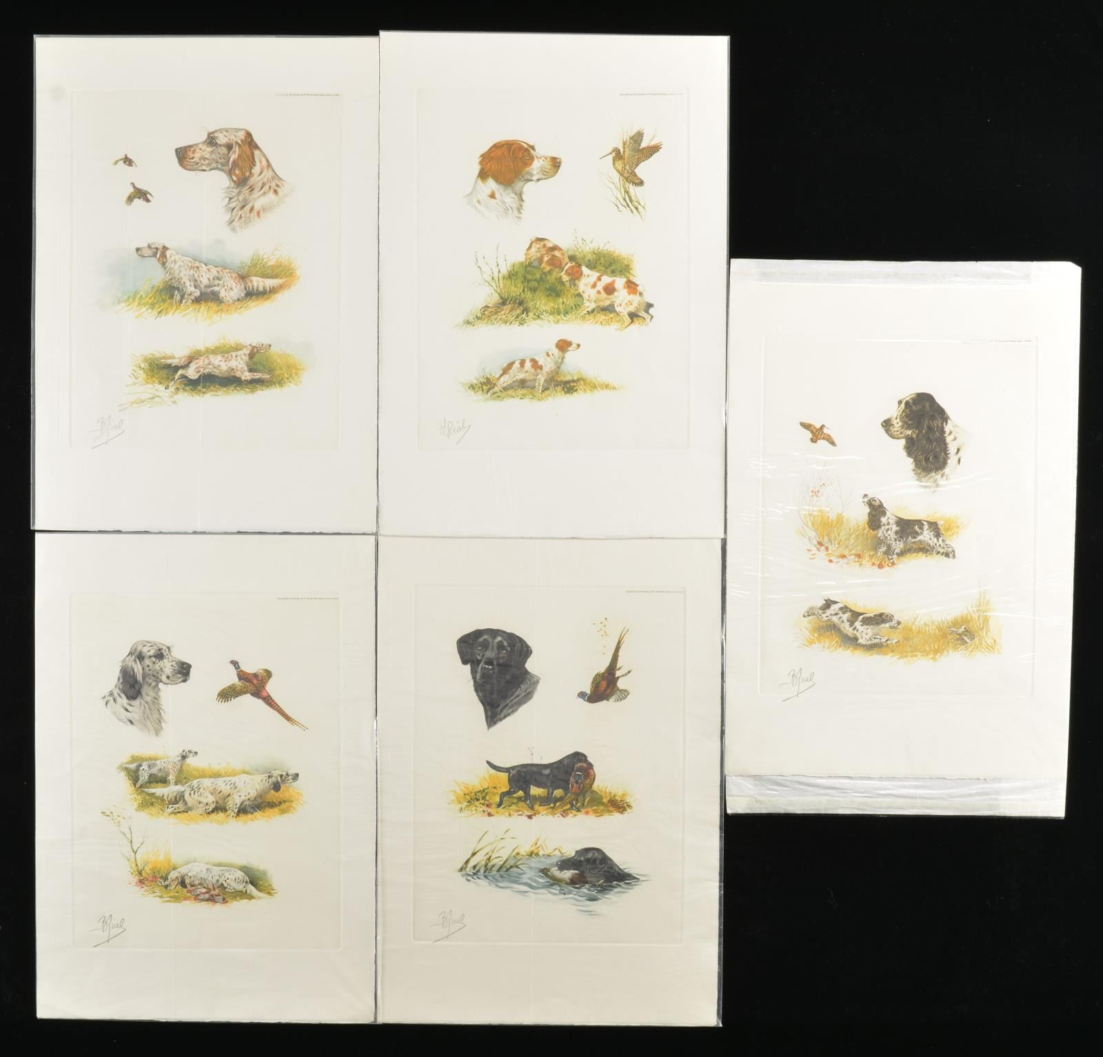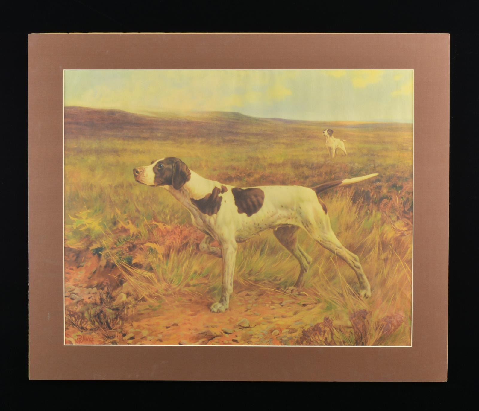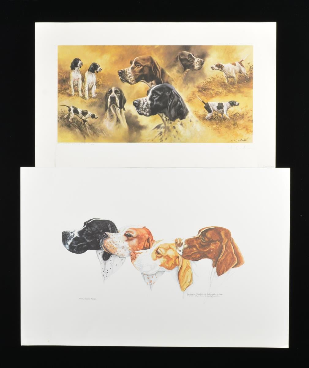 A large assortment of dog related hunting prints including: "INTO THE WILD" by Morten E Solberg, printed by Greenwich Workshop. / Limited Edition No. 456/850 Print by Mick Cawston 1984. / 6 Hunting god prints from the International Fine Arts Society by Riab. / A Folio containing Limited Edition prints by Silliam Harris: "Working Wonders" No. 771 / 850, "Young Entrys & Old Stagers" No. 61/850, "A Day Out" No. 106/850, & "The Wild Bunch" No. 143/850. Also includes 2 prints by Nigel Hemming. CONDITION: prints appear in very good condition w/ some prints having notes on back. PROVENANCE: From the Collection of Thomas B. & Freeda Harper Jr. (02-16565/MD). $500-1,000.