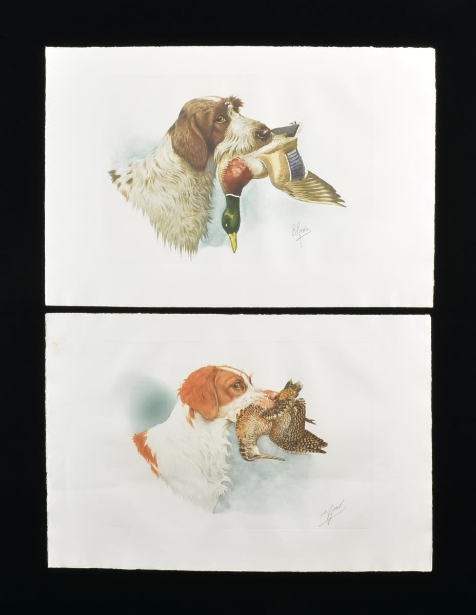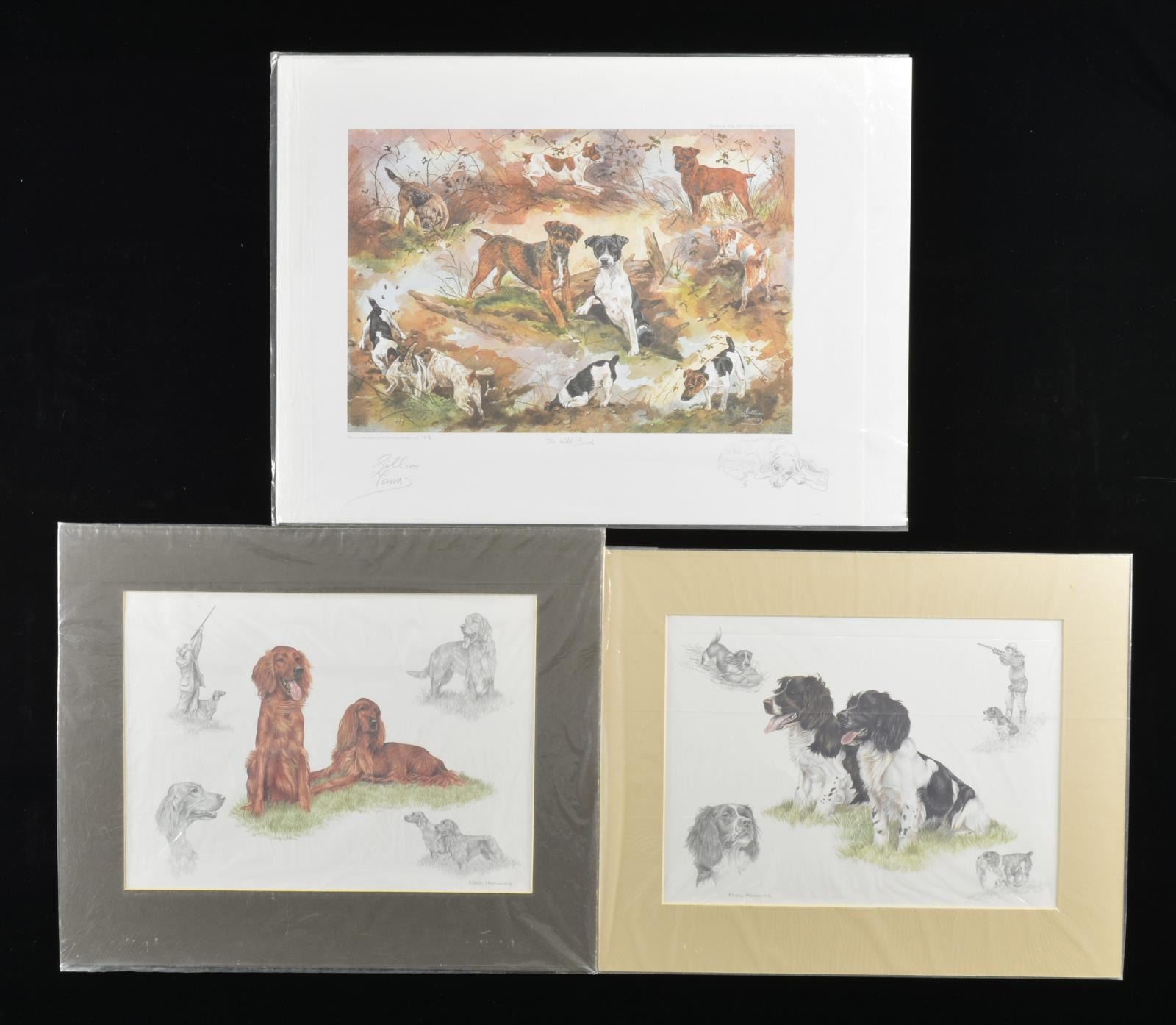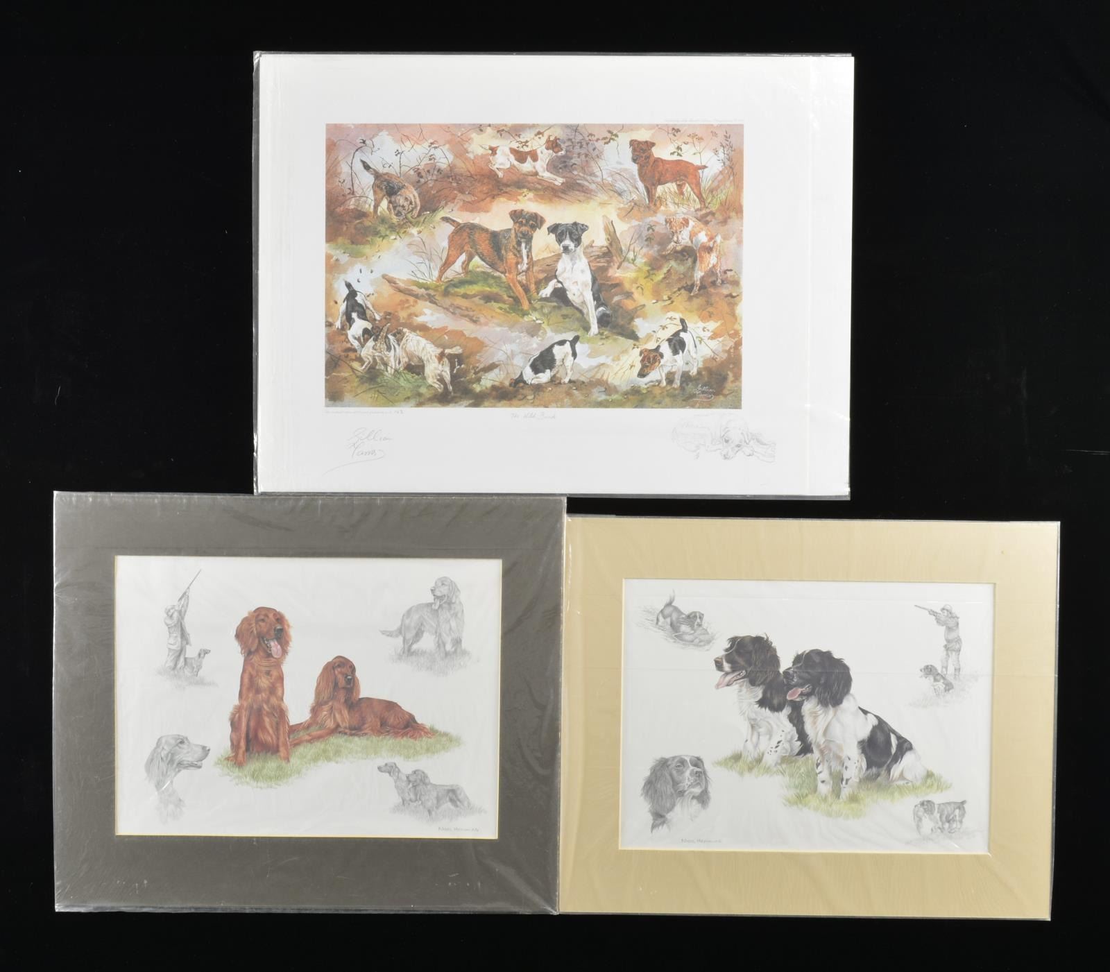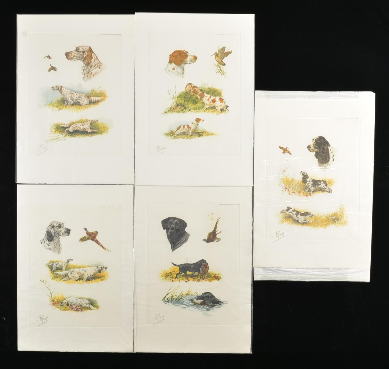 A large assortment of dog related hunting prints including: "INTO THE WILD" by Morten E Solberg, printed by Greenwich Workshop. / Limited Edition No. 456/850 Print by Mick Cawston 1984. / 6 Hunting god prints from the International Fine Arts Society by Riab. / A Folio containing Limited Edition prints by Silliam Harris: "Working Wonders" No. 771 / 850, "Young Entrys & Old Stagers" No. 61/850, "A Day Out" No. 106/850, & "The Wild Bunch" No. 143/850. Also includes 2 prints by Nigel Hemming. CONDITION: prints appear in very good condition w/ some prints having notes on back. PROVENANCE: From the Collection of Thomas B. & Freeda Harper Jr. (02-16565/MD). $500-1,000.