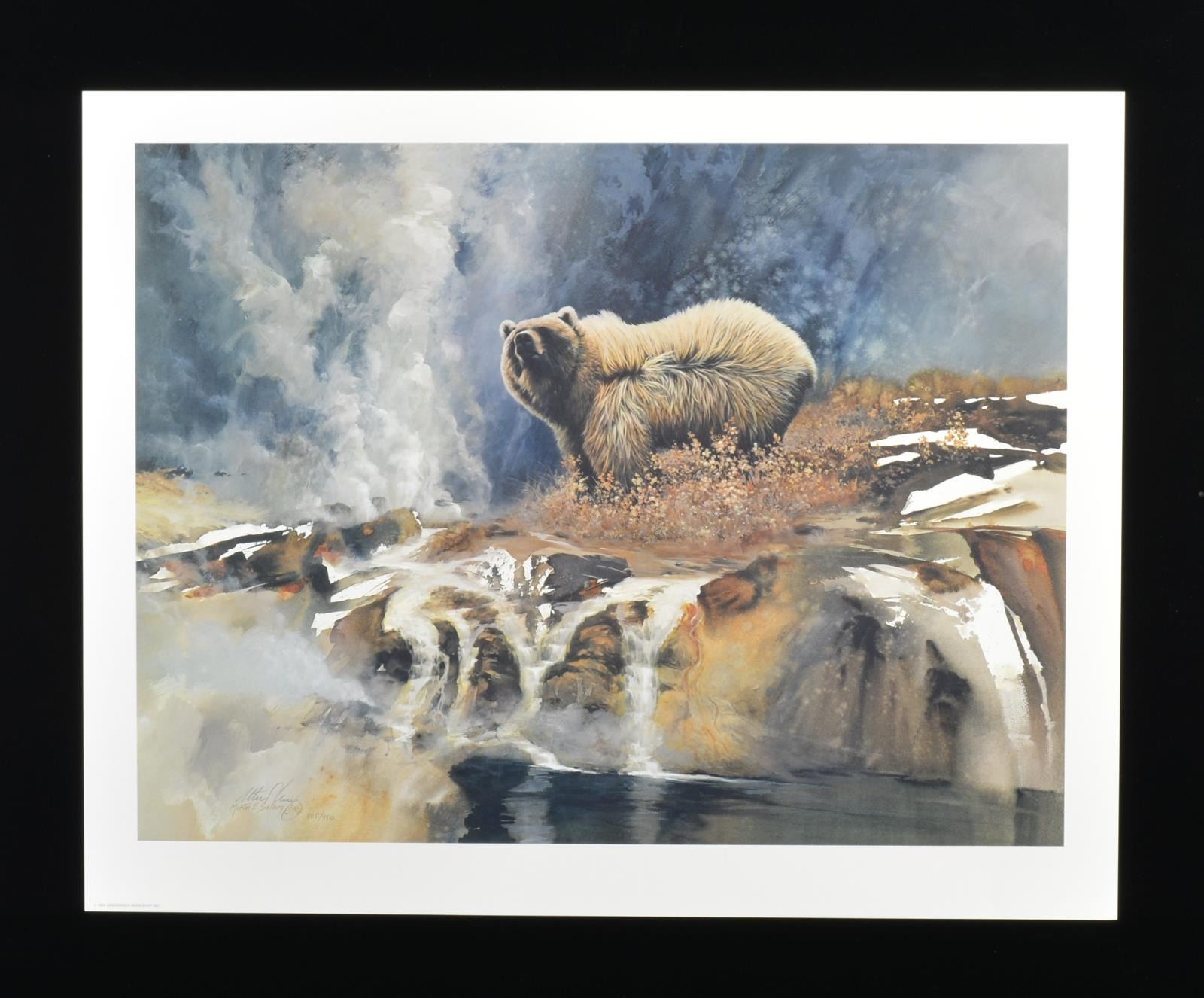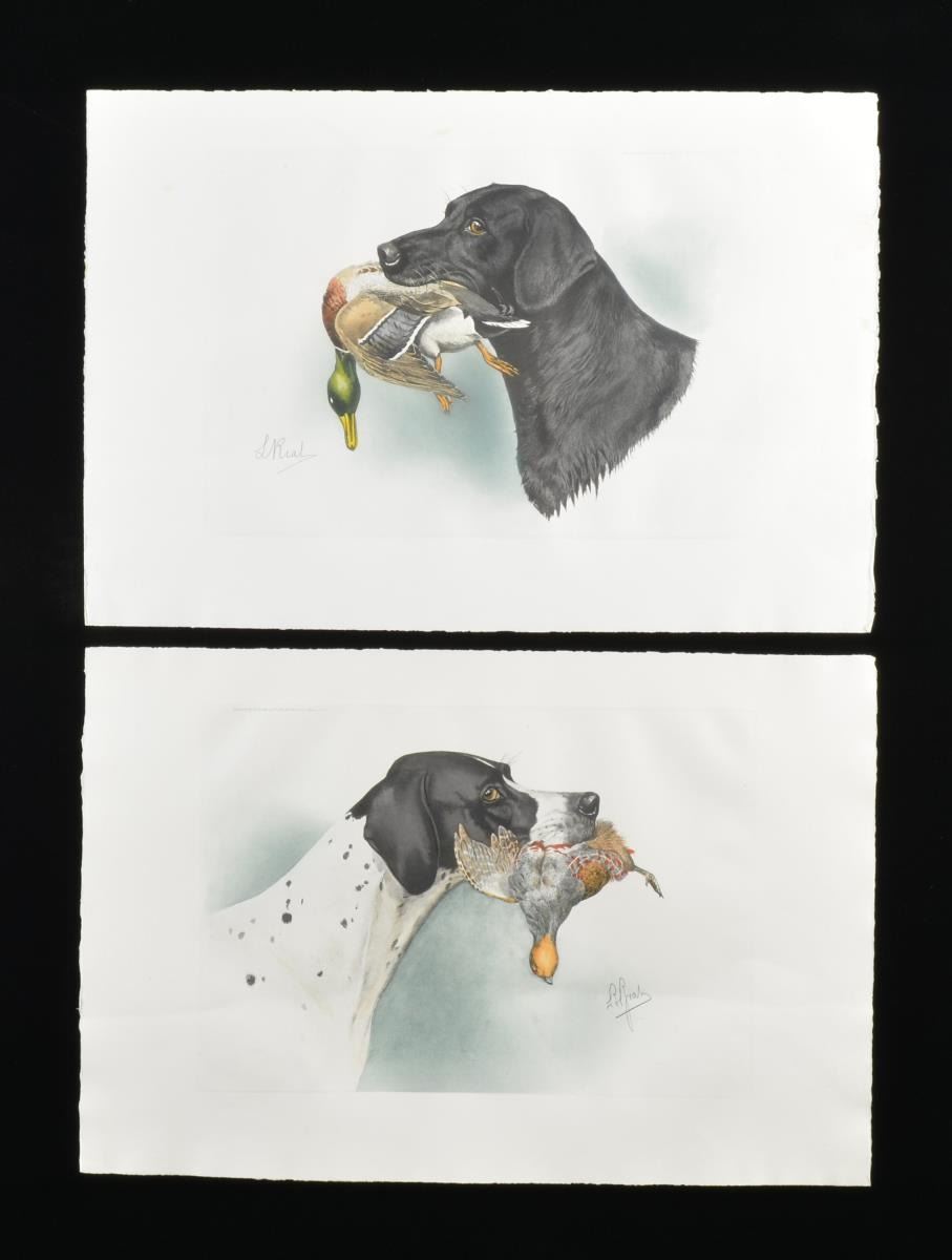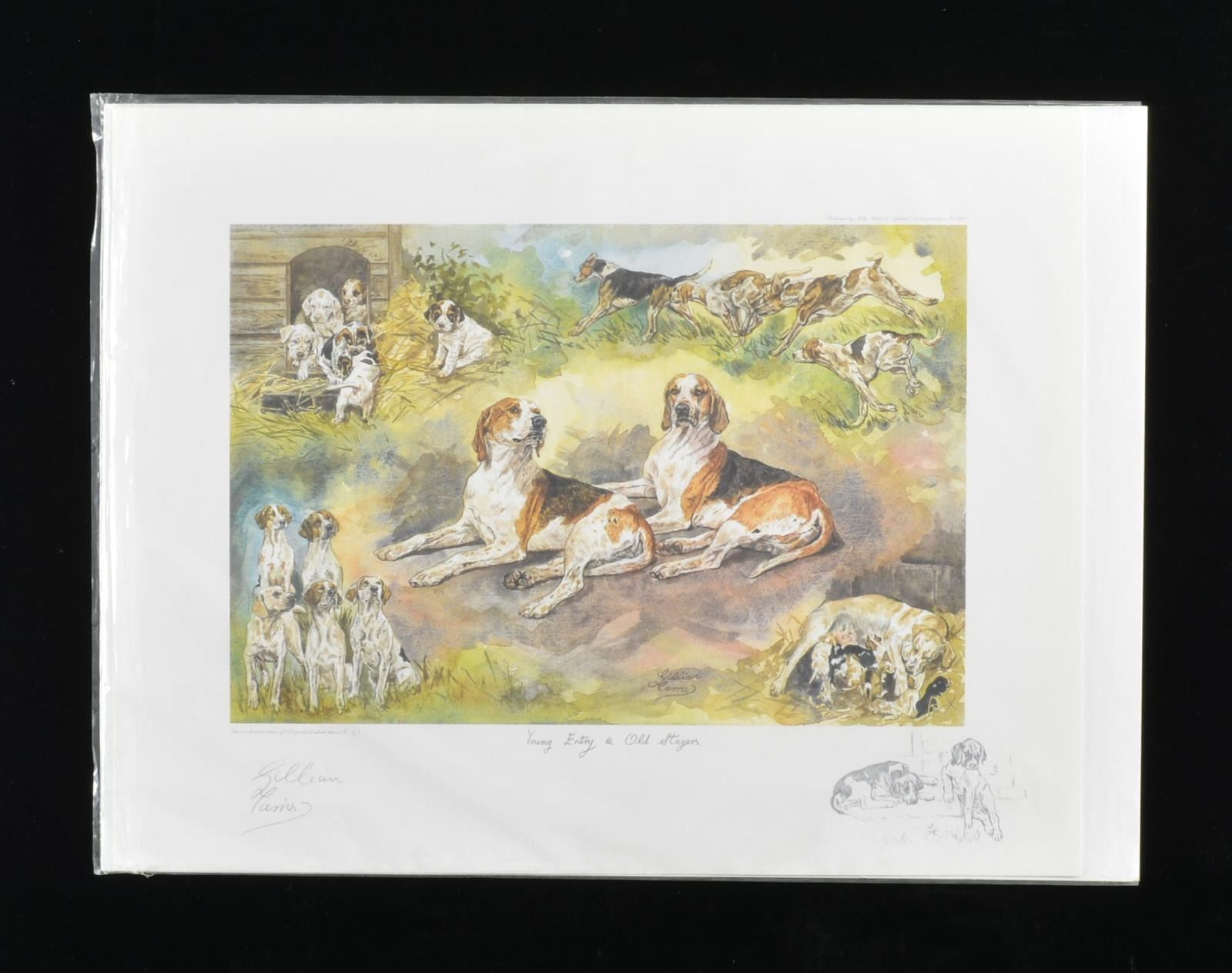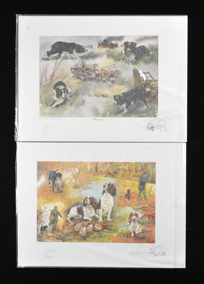 A large assortment of dog related hunting prints including: "INTO THE WILD" by Morten E Solberg, printed by Greenwich Workshop. / Limited Edition No. 456/850 Print by Mick Cawston 1984. / 6 Hunting god prints from the International Fine Arts Society by Riab. / A Folio containing Limited Edition prints by Silliam Harris: "Working Wonders" No. 771 / 850, "Young Entrys & Old Stagers" No. 61/850, "A Day Out" No. 106/850, & "The Wild Bunch" No. 143/850. Also includes 2 prints by Nigel Hemming. CONDITION: prints appear in very good condition w/ some prints having notes on back. PROVENANCE: From the Collection of Thomas B. & Freeda Harper Jr. (02-16565/MD). $500-1,000.