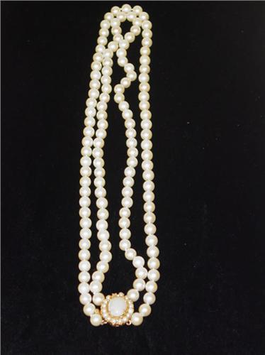 20" DOUBLE STRAND PEARLS W/ LARGE OVAL CLASP W/ OPAL CENTER SURROUNDED BY PEARLS