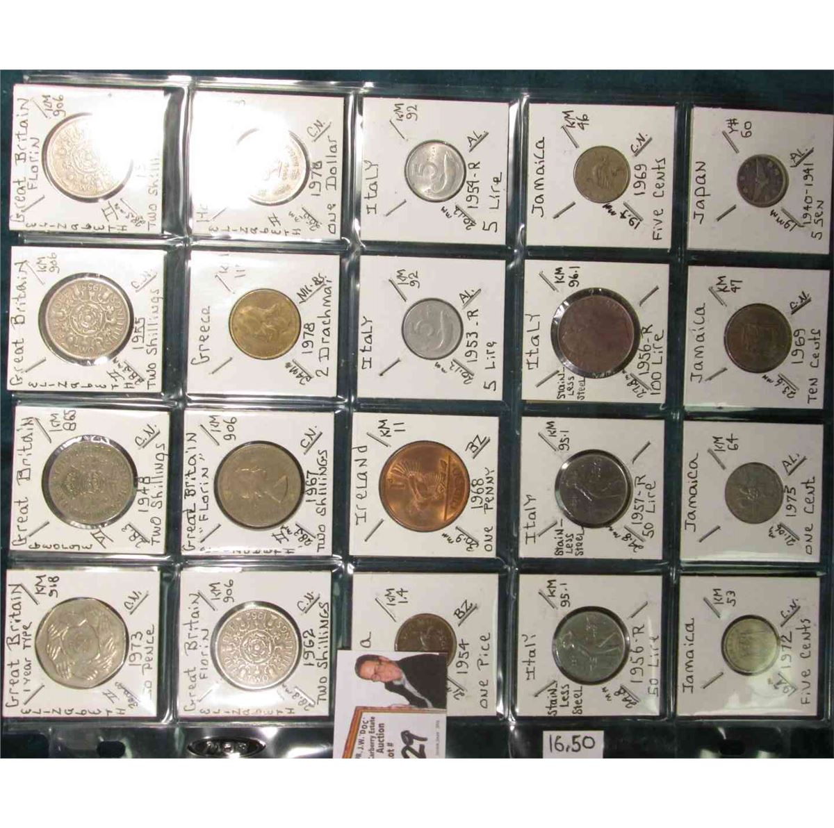 (20) Different World Coins in a plastic page. All Different and attributed. Includes Great Britain, Greece, Hong Kong, India, Ireland, Italy, Jamaica, & Japan. KM Value $16.00