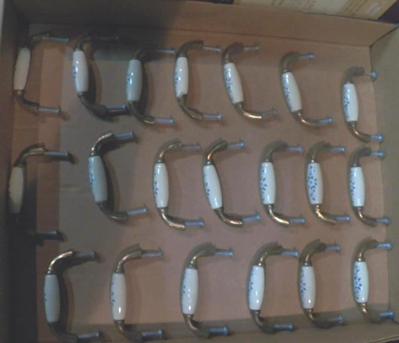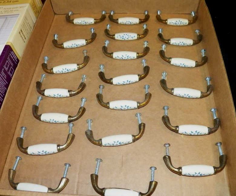 Floral Design Porcelain & Brass Cabinet or Drawer Handles Pulls with Screws