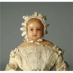 Lot 53: 20" ENGLISH WAX BABY. A very appealing wax baby with blue inset eyes, applied and painted hair, on a cloth body with wax lower arms and legs. Doll is wearing an antique white cotton christening gown and lace bonnet. CONDITION: Overall condition is very good, pinkie missing on right hand. 1-1007 JL239