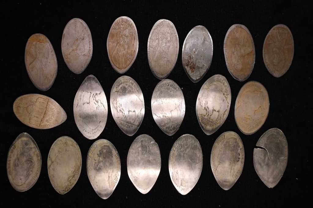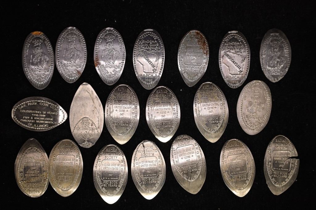 WAR CENTS, 5-BUFFALO NICKELS AND 8-JEFFERSON NICKELS. 19 ARE RACINE NUMISMATICS AND 1 IS OAK PARK COIN CLUB