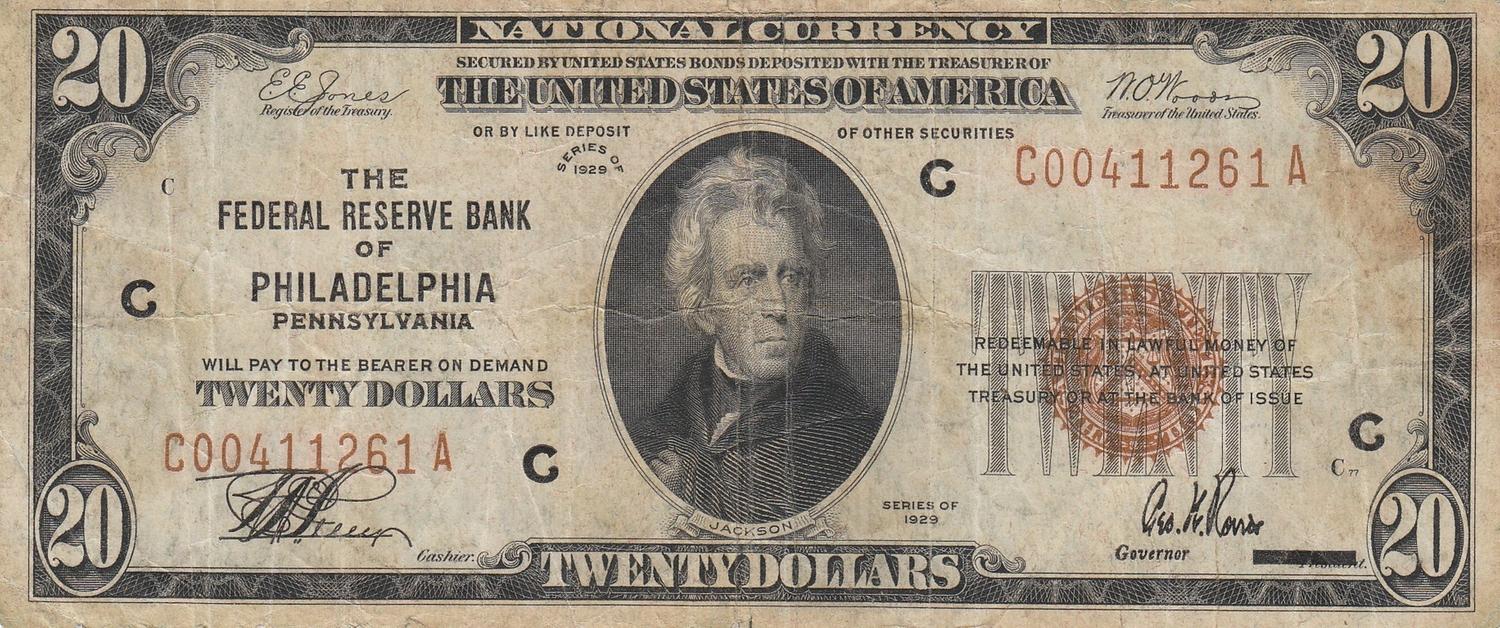 $20 FRBN PHILADELPHIA 1929 BROWN SEAL