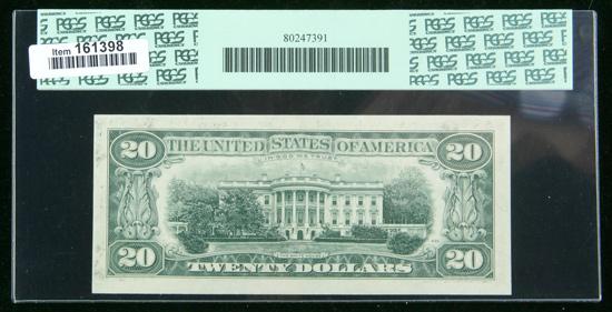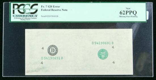 ? $20 Federal Reserve Note. Missing Face Printing. PCGS New 62PPQ. It's incredible that errors like this make it out of the BEP, but alas mistakes happen--and that's why there are collectors around to snatch up these mistakes when they are available. The face design printing is completely missing, leaving only the overprint with serial numbers and District and Treasury seals on the face.