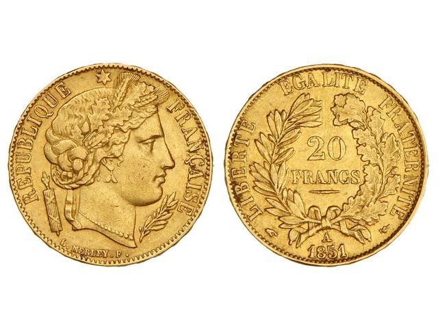 20 Francos. 1851-A. II REPÚBLICA. PARÍS. AU. Ceres. KM-762. MBC+.