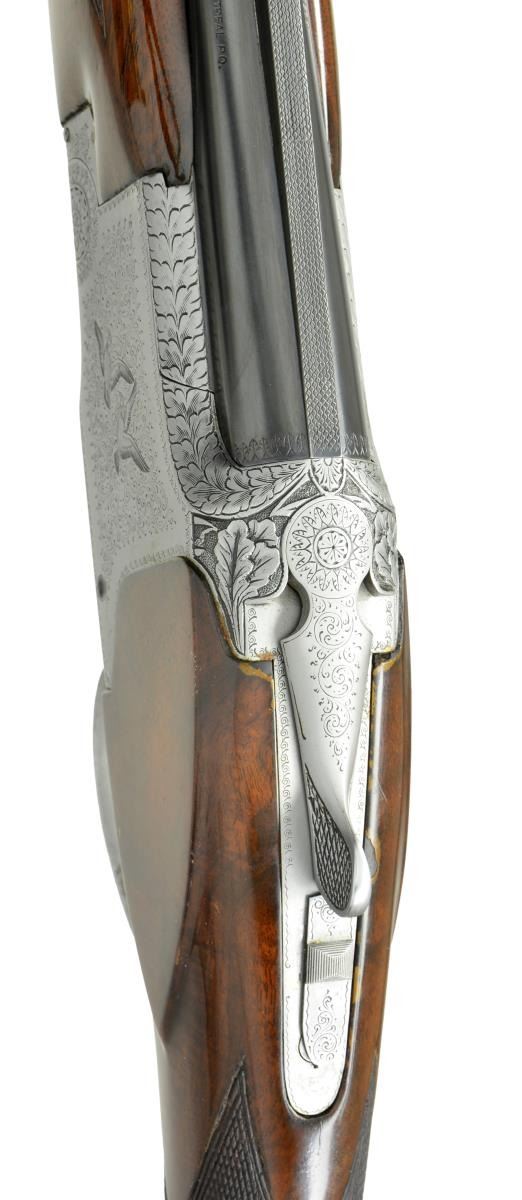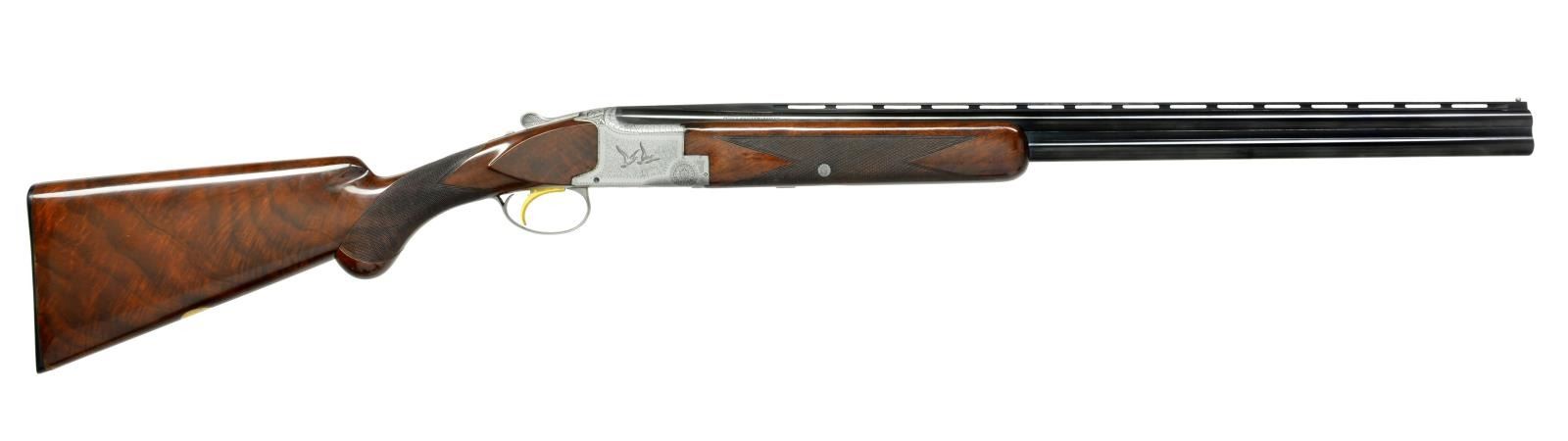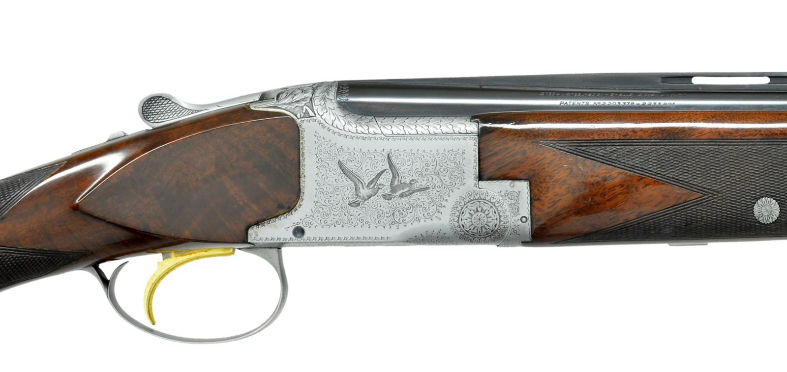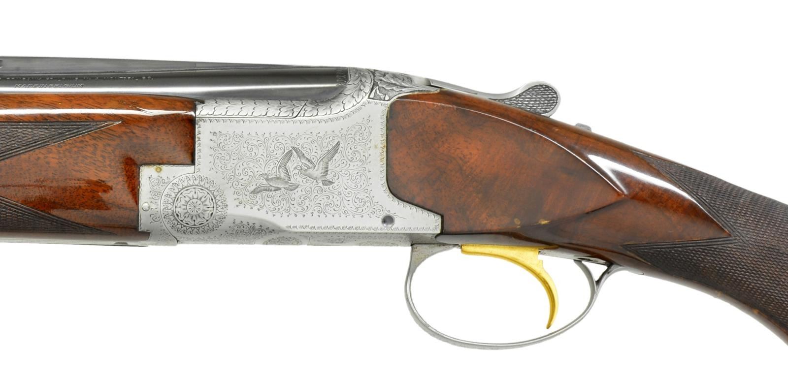 GUN. Cal. 20 Ga., 3”. S# 43528V7. Marked for IC & Mod chokes, bbls. measure 26 3/8”, fitted w/ narrow matted ventilated ribs. All correct factory markings are on top along w/ “MADE IN BELGIUM”. Small sized coin finished Browning OU action features gold plated single selective trigger. Action engraved in usual “pigeon” style w/ attractive vignettes of pigeons flying through a field of nicely cut scroll on sides. Rose bouquet highlights are on bottom & fences are nicely relief carved in oak leaf motif. Short tang, rnd. knob buttstock of nicely crotch figured American walnut measures 14 1/4” over composition Browning buttplate. Point pattern checkering is at grip & gold oval on toeline is engraved “RLW”. Field type forend matches well. Chokes still measure IC & Mod. DAH: 2 3/8”. DAC: 1 9/16”. WEIGHT: 6 lbs. 6 oz. CONDITION: very fine retaining over 95% original finishes on wood & metal. Gun tests positive for salt using the silver nitrate test. Stocks & associated metal have salt damage at base of top tang either side of top lever w/ some rusting of metal & bubbling of stock finish. There is some crazing of varnish finish, mostly at toe & some chips plus marks at grip. Bright shiny bores. Mechanically fine. (20-520/MGM45). CURIO. $3,000-5,000.
