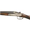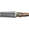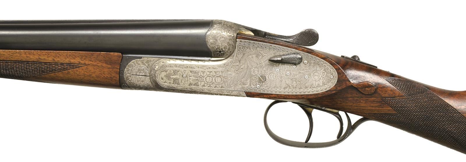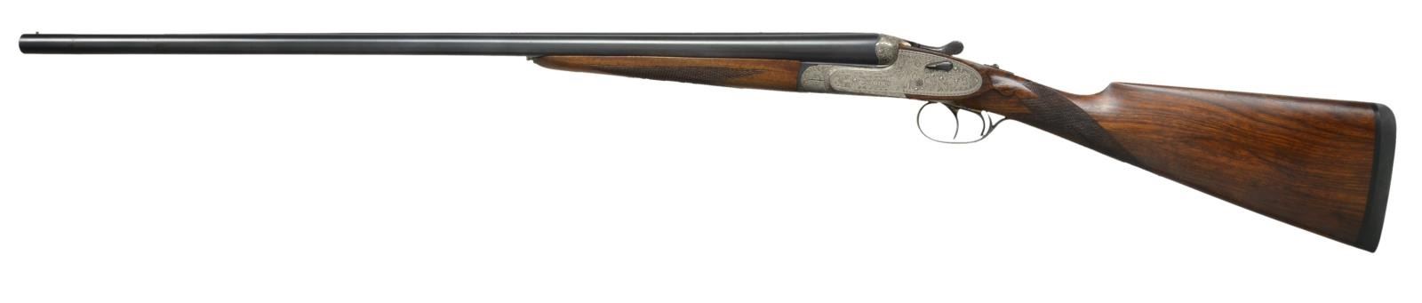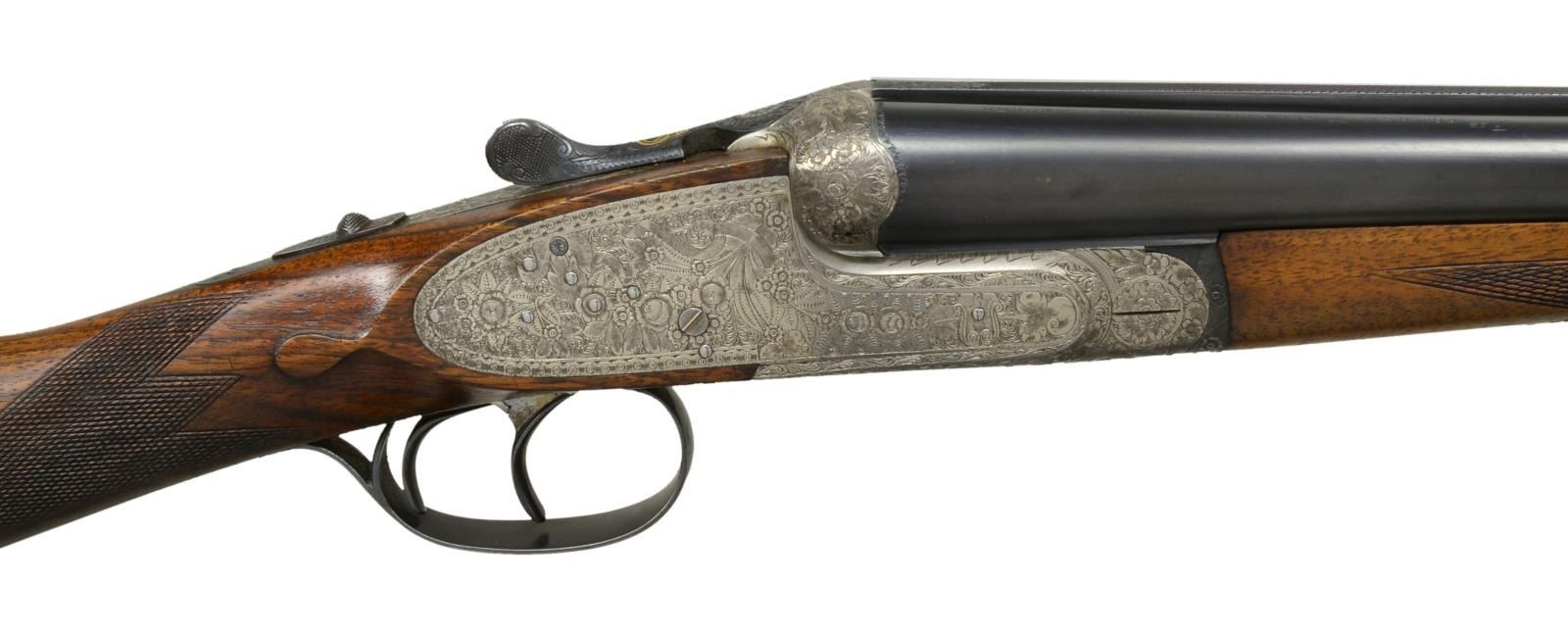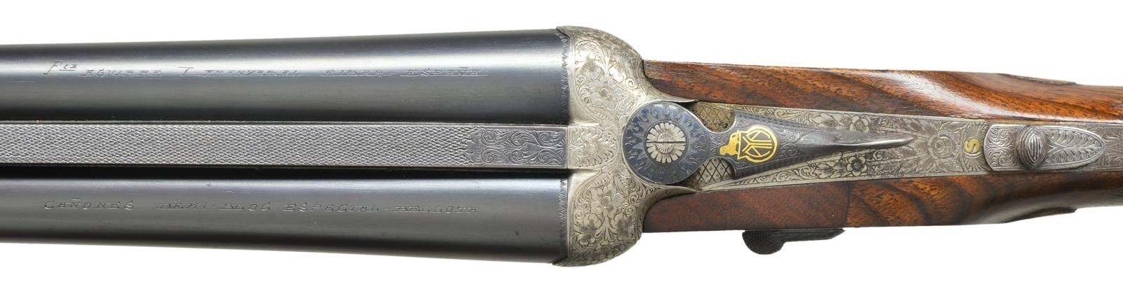 GUN. Cal. 20 ga. 2 3/4". S# 125411. The 28" chopperlump bbls. fitted with choke tubes have slightly raised matted rib and are engraved with maker's name, address and steel type on tops. Bbl. flats are stamped with 1960 Spanish Nitro proofs for 2 3/4" chambers. Coin finished sidelock action features automatic safety, hidden third fastener, bushed strikers, sideclips, raised rib tumbler end cocking indicators, hand detachable sidelocks and double triggers (front articulated). Action and lockplates are hand engraved with near full coverage large shaded scroll with rose and other floral highlights. Bottom of action is engraved with maker's name in an arch. AYA logo is inlaid in gold on blued top lever. Blued single beaded trigger guard has rose and scroll on bow and serial number on tang. Relatively plain European walnut straight grip buttstock measures 14 1/2" over "Decelerator" pad and features drop points and point pattern grip checkering. Matching splinter ejector forend has Anson release. MEASUREMENTS: BBLS: Bore Diameter: R .614", L .614". Restriction (Choke Tubes): R .003" (IC), L .006" (IC). Min. Wall Thickness: R .038", L .036". STOCK: DAH: 2 1/8". DAC: 1 7/16". LOP: 14 1/2". CAST: neutral. WEIGHT: 6 lb. 8 oz. CONDITION: very good to fine as partially refinished. Bbls. retaining nearly all of a good quality reblack, most likely done at time of tube installation. Action and lockplates retain nearly all of their original coin finish with some areas slightly darkened. There is silvering on thumbpiece and on bead and tang of trigger guard. Stocks retain most of an old light refinish with a scattering of subsequent marks. Checkering slightly worn. Bores are bright and shiny. Mechanically good. (22-5269/MGM). CURIO. $2,000-3,000.