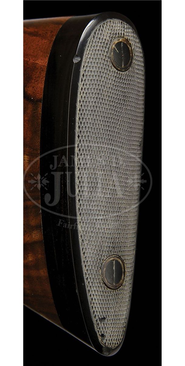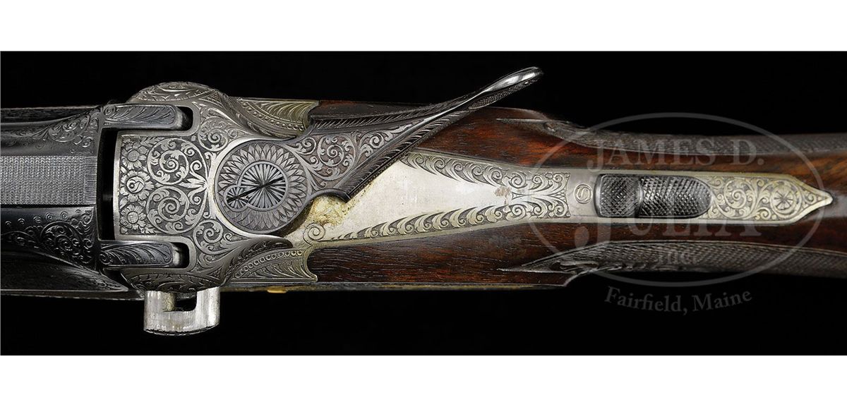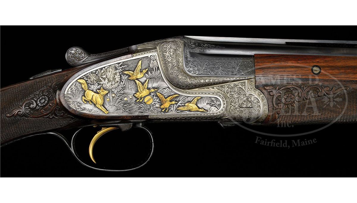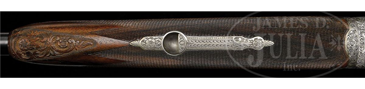 SN 96458. Cal. 20 ga. 26-3/4" Demi-bloc bbls with matted, ventilated rib are marked "GEBR. MERKEL SUHL" and "MADE IN GDR" on left side ejector boss. Bosses are engraved with large, shaded scroll. Bottom bbl is stamped with German nitro proofs with a date of 11/86. Ends of gold-plated extractors are stamped with "76" (chamber length) and with "3/4" and "1/4" (chokes). Coin finished, double Kersten action with hand detachable sidelocks, is fitted with non-automatic safety and gold-plated single selective trigger. Interiors of locks are engine turned and most internals are gold-plated. Action is engraved with full coverage, well cut, large, shaded scroll with floral highlights. "GEBR MERKEL" is in arched band on bottom. Lockplates are fully engraved with scenes of canines and game birds, which are relief gold inlaid, and are in appropriate semi-relief engraved backgrounds; a setter is approaching group of pheasants (two flushing) in open woods on left; right plate portrays fox surprising group of four mallards which are erupting from marsh. Round knob, semi pistol grip buttstock is of strikingly fiddle figured and nicely veined European walnut and measures 15-1/4" over 3/4" thick checkered horn buttplate. Well cut, 28LPI checkering has scroll acanthus carving with floral highlights at either end. Matching splinter 3-pc ejector forend has Deeley release. Carving is on both sides at rear and at tip. Bore diameter: top -.618, bottom -.614. Bore restrictions: top -.015 (Mod), bottom -.010 (IC). Wall thickness: top-.035, bottom -.032. Drop at heel: 1-15/16", drop at comb: 1-3/8". Weight: 7 lbs. 1 oz. LOP: 15-1/4". CONDITION: Excellent. Bbls retain nearly all of their orig satin blue. There is a small area of active oxidation at tip of left top piece of forend under wood. Gold wash on right extractor is considerably silvered. Action retains nearly all of its coin finish, slightly darkened. Top lever and trigger guard are also excellent, with only a hint of silvering. Stocks retain essentially all of their orig rubbed oil finish with one or two very light marks. Bores are excellent. Action is tight. Ejectors are in time. Trigger works. 4-49190 MGM232