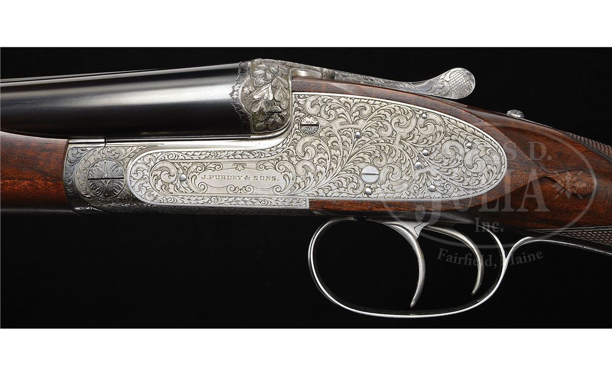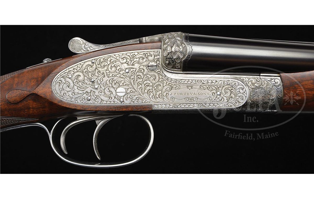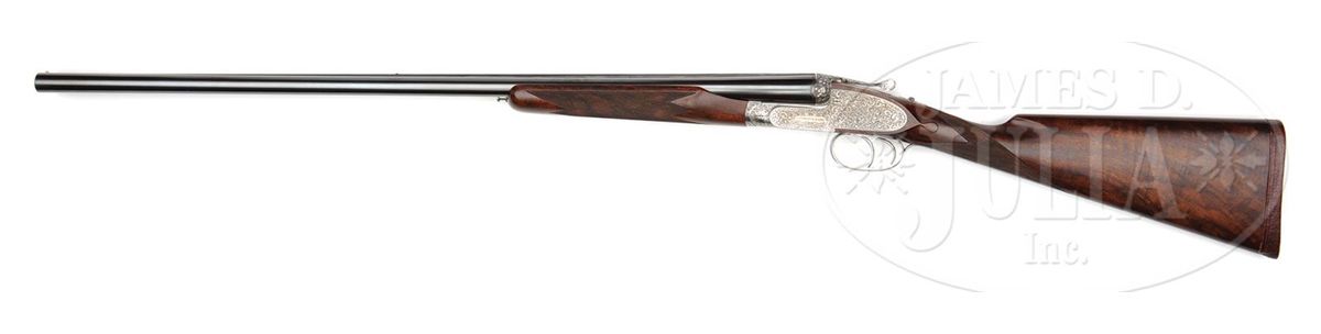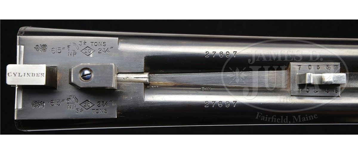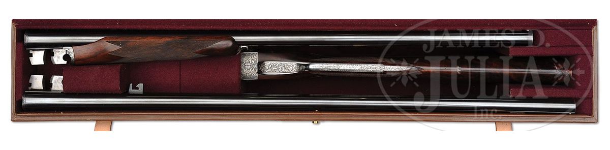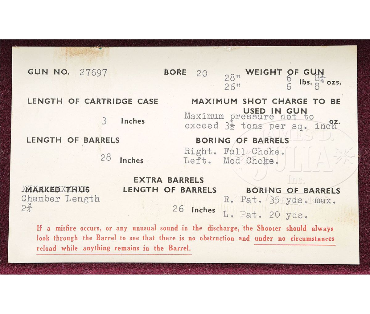 SN 27697. (1970) Cal. 20 ga. 2-3/4" Chambers in 26" bbls and 3" chambers in 28" bbls. Both bbl sets are chopper lump, with raised, narrow, matted game ribs, fitted with two ivory beads, and engraved "J. Purdey & Sons" and "Audley House. South Audley Street. London. England" on tops. Bbl flats are stamped with London nitro proofs. Bottoms of bbls are stamped with SNs and bbl makers initials "GW" (George Wood). Tube nos. "70653" "70654" are on loop of 28" bbls. "70655" and "70656" are on 26" bbls. Bottom of rear lump of 28" bbls is engraved "Choke", and bottom of rear lump of 26" bbls is engraved "Cylinder". Coin finished, self-opening action features non-automatic safety (SAFE inlaid in gold), bushed strikers, hidden third fastener, side clips, raised rib tumbler end cocking indicators, and double triggers with front trigger checkered and articulated. Front trigger fires left bbl and rear trigger fires right. Triggers are turned for right hand shooter. Action is engraved with large, flowing, shaded, acanthus scroll with strap work highlights in the manner of, and most likely done by, noted engraver, Ken Hunt. No signature found. Fences are deeply relief carved in oak leaf and acorn motif. "J. Purdey & Sons" is in scroll flanked cartouche on each lockplate. Bottom of action is engraved "J. PURDEY & SONS" "LONDON" "ENGLAND" in lozenge. Single beaded trigger guard has bead correctly placed for right hand shooter. Scroll engraving matches action and SN is at grip. Well marbled and lightly figured European walnut straight grip buttstock measures 14-5/8" over red leather covered pad, and features drop points, standard point pattern checkering, and silver initials "W F F" individually inlet on toe line. Matching beavertail ejector forend has Anson release and fits both sets of bbls. Iron is stamped with long time Purdey actioner's initials, "B.D" (Ben Delay). 28" Bbls: Bore diameter: left-.614, right -.617. Bore restrictions: left -.015 (Mod), right -.025 (Full). Wall thickness: left -.035, right -.033. Drop at heel: 1-5/8", drop at comb: 1-7/16". Weight: 6 lbs. 8 oz. LOP: 14-5/8". 26" Bbls: Bore diameter: left-.613, right -.613. Bore restrictions: left -.000 (Cyl), right -.002 (Cyl). Wall thickness: left -.035, right -.032. Drop at heel: 1-5/8", drop at comb: 1-7/16". Weight: 6 lbs. 8 oz. LOP: 14-5/8". Makers leather motor case, configured for gun and both sets of bbls, has stitched leather corners, and is embossed with initials "W. F. F." on top. Interior is lined in burgundy cloth with three labels in lid; black leather gold embossed makers label, paper charge card for this gun with all specifications, and "correct method of placing gun in case" label. Case contains 2-pc beech and brass cleaning rod with mop, brush and jag in red morocco wallet, a red wallet with action cleaning brushes, another red wallet with Purdey marked snap caps, a black morocco wallet with pull through cleaning equipment, an unmarked striker bottle with spare strikers, a Purdey marked round oil bottle, a 20 ga broken case remover, and two keys. CONDITION: Excellent, with evidence of very limited use. Bbls retain nearly all of their orig blue with a few light pings and scratches. Coin finish of action is excellent, darkening slightly. Stocks show only a few light dents and scratches, mostly on top left side of butt. Checkering is excellent, darkening. Bores are excellent, bright and shiny throughout. Action is tight. Bbls are on face. Ejectors are perfectly timed. Case leather is excellent, with only a few light rubs and marks. Straps and handle are very fine. Interior cloth is excellent, with only a few minor rubs from gun and bbls. Labels are excellent. Charge card is slightly soiled. Accessories are excellent. A very fine all-purpose gun, built by some of Purdey's oldest and most highly regarded workmen, with some interesting features. 4-49354 MGM242