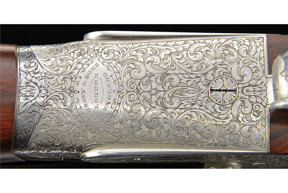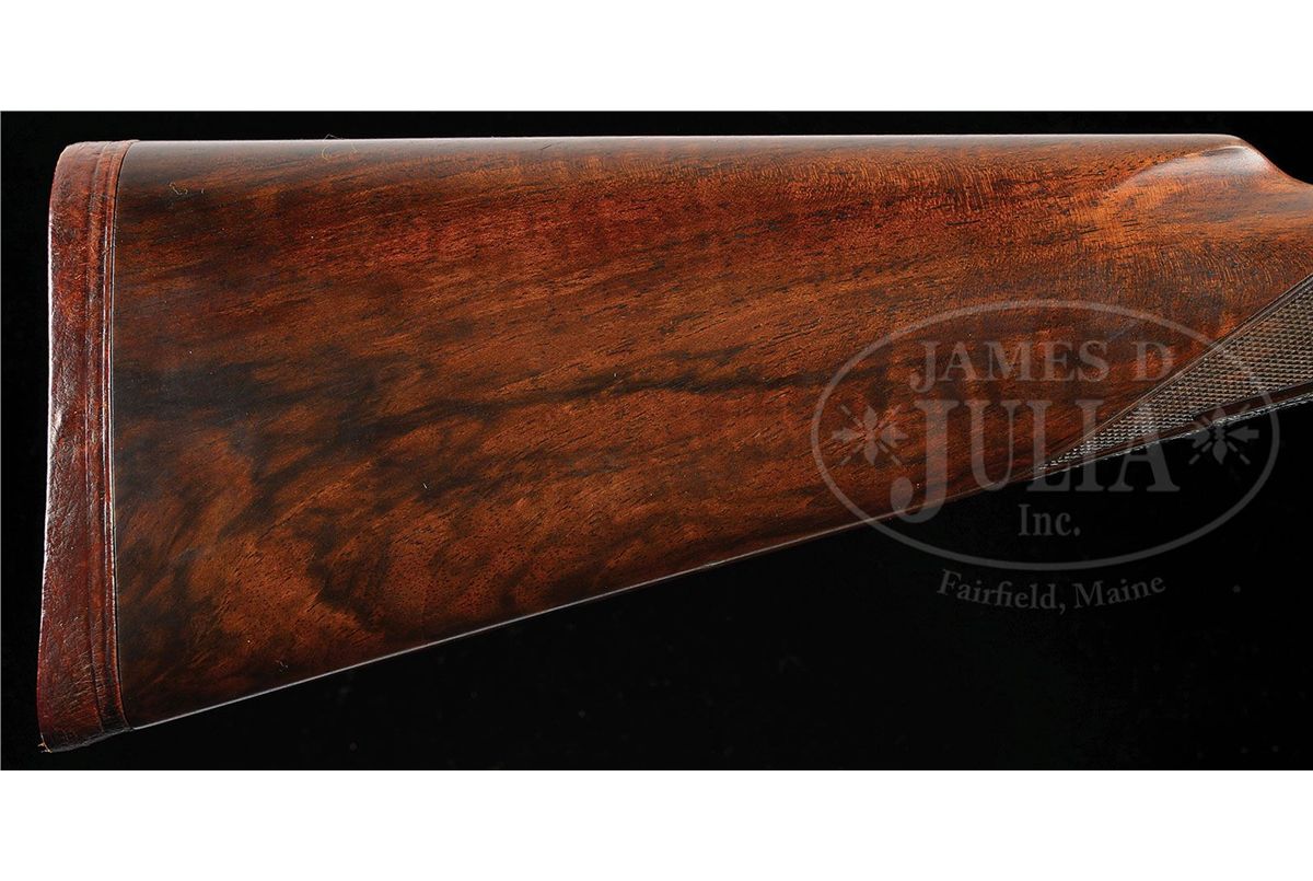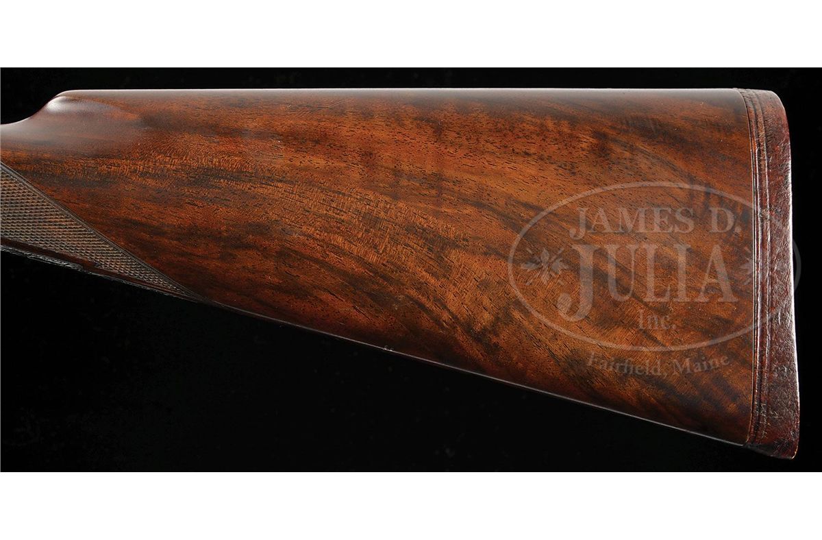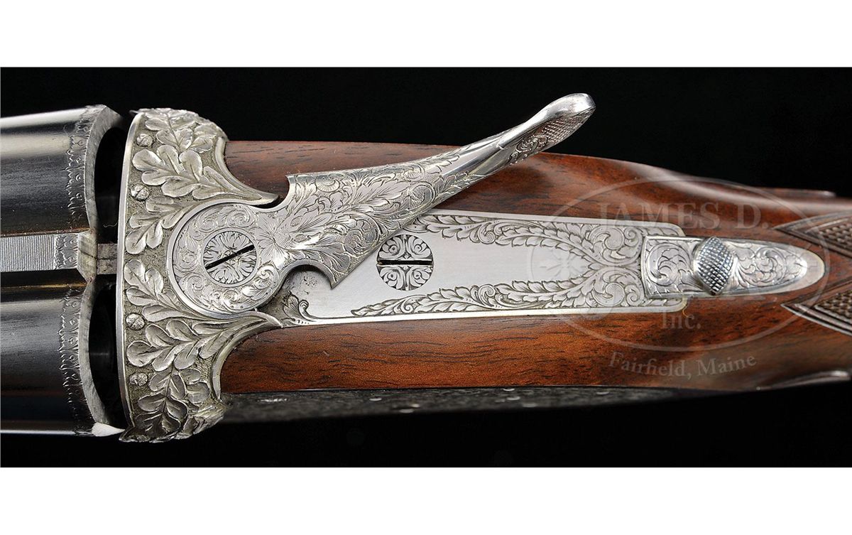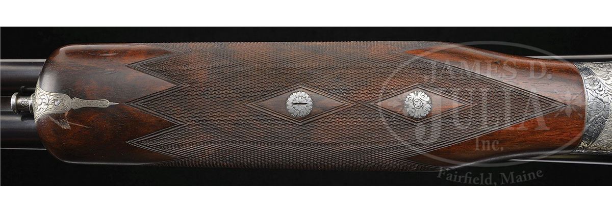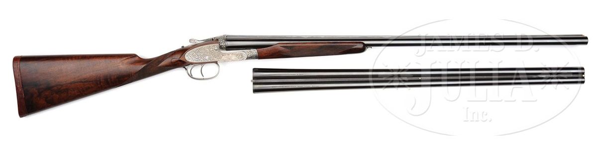 SN 27697. (1970) Cal. 20 ga. 2-3/4" Chambers in 26" bbls and 3" chambers in 28" bbls. Both bbl sets are chopper lump, with raised, narrow, matted game ribs, fitted with two ivory beads, and engraved "J. Purdey & Sons" and "Audley House. South Audley Street. London. England" on tops. Bbl flats are stamped with London nitro proofs. Bottoms of bbls are stamped with SNs and bbl makers initials "GW" (George Wood). Tube nos. "70653" "70654" are on loop of 28" bbls. "70655" and "70656" are on 26" bbls. Bottom of rear lump of 28" bbls is engraved "Choke", and bottom of rear lump of 26" bbls is engraved "Cylinder". Coin finished, self-opening action features non-automatic safety (SAFE inlaid in gold), bushed strikers, hidden third fastener, side clips, raised rib tumbler end cocking indicators, and double triggers with front trigger checkered and articulated. Front trigger fires left bbl and rear trigger fires right. Triggers are turned for right hand shooter. Action is engraved with large, flowing, shaded, acanthus scroll with strap work highlights in the manner of, and most likely done by, noted engraver, Ken Hunt. No signature found. Fences are deeply relief carved in oak leaf and acorn motif. "J. Purdey & Sons" is in scroll flanked cartouche on each lockplate. Bottom of action is engraved "J. PURDEY & SONS" "LONDON" "ENGLAND" in lozenge. Single beaded trigger guard has bead correctly placed for right hand shooter. Scroll engraving matches action and SN is at grip. Well marbled and lightly figured European walnut straight grip buttstock measures 14-5/8" over red leather covered pad, and features drop points, standard point pattern checkering, and silver initials "W F F" individually inlet on toe line. Matching beavertail ejector forend has Anson release and fits both sets of bbls. Iron is stamped with long time Purdey actioner's initials, "B.D" (Ben Delay). 28" Bbls: Bore diameter: left-.614, right -.617. Bore restrictions: left -.015 (Mod), right -.025 (Full). Wall thickness: left -.035, right -.033. Drop at heel: 1-5/8", drop at comb: 1-7/16". Weight: 6 lbs. 8 oz. LOP: 14-5/8". 26" Bbls: Bore diameter: left-.613, right -.613. Bore restrictions: left -.000 (Cyl), right -.002 (Cyl). Wall thickness: left -.035, right -.032. Drop at heel: 1-5/8", drop at comb: 1-7/16". Weight: 6 lbs. 8 oz. LOP: 14-5/8". Makers leather motor case, configured for gun and both sets of bbls, has stitched leather corners, and is embossed with initials "W. F. F." on top. Interior is lined in burgundy cloth with three labels in lid; black leather gold embossed makers label, paper charge card for this gun with all specifications, and "correct method of placing gun in case" label. Case contains 2-pc beech and brass cleaning rod with mop, brush and jag in red morocco wallet, a red wallet with action cleaning brushes, another red wallet with Purdey marked snap caps, a black morocco wallet with pull through cleaning equipment, an unmarked striker bottle with spare strikers, a Purdey marked round oil bottle, a 20 ga broken case remover, and two keys. CONDITION: Excellent, with evidence of very limited use. Bbls retain nearly all of their orig blue with a few light pings and scratches. Coin finish of action is excellent, darkening slightly. Stocks show only a few light dents and scratches, mostly on top left side of butt. Checkering is excellent, darkening. Bores are excellent, bright and shiny throughout. Action is tight. Bbls are on face. Ejectors are perfectly timed. Case leather is excellent, with only a few light rubs and marks. Straps and handle are very fine. Interior cloth is excellent, with only a few minor rubs from gun and bbls. Labels are excellent. Charge card is slightly soiled. Accessories are excellent. A very fine all-purpose gun, built by some of Purdey's oldest and most highly regarded workmen, with some interesting features. 4-49354 MGM242