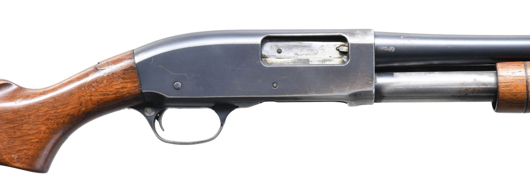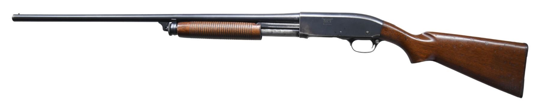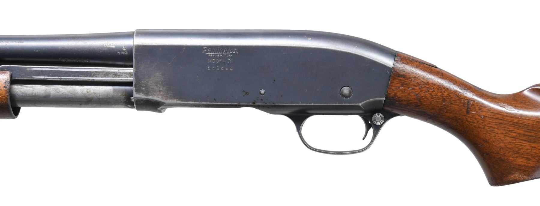 Cal. 12 GA., 2 3/4". S# 548444. Plain 28" barrel w/ steel bead & "FULL" marked choke. Tubular mag. Walnut stock set w/ Rem. buttplate. CONDITION: fair worn blue. Fair wood finish with repaired break at top of wrist. Shiny bore; appears to have slight bulge 9.5" from breech. (25-4932/MD). CURIO. $300-400.