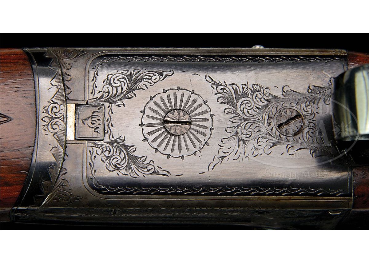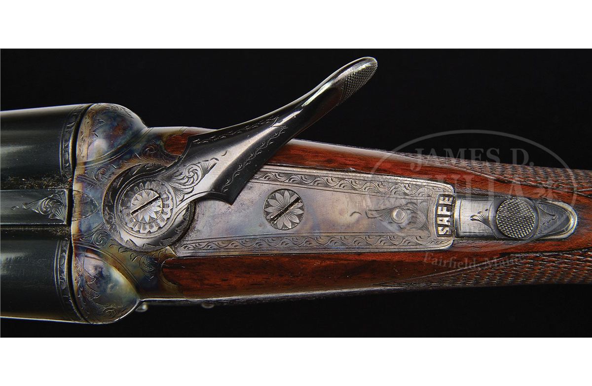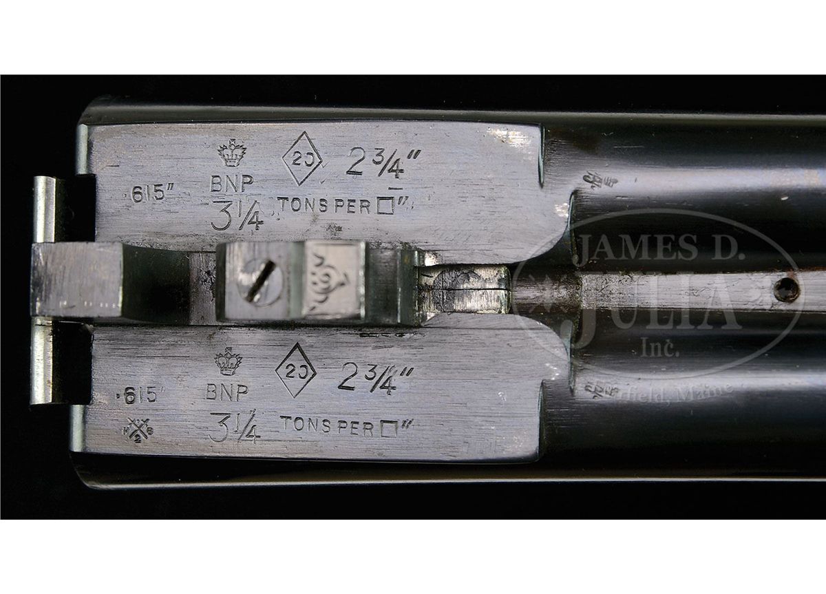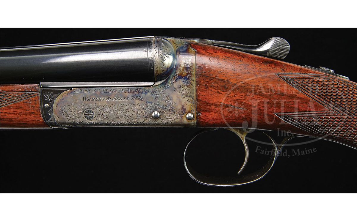 SN 129439. Cal. 20 ga. 2-3/4" Chambers. 26" Dovetailed bbls are marked "Webley & Scott Ltd." and "Birmingham" on tops, and "Abercrombie & Fitch Co. Agents" on narrow, concave game rib. Bbl flats are stamped with Birmingham nitro proofs for 2-3/4" chambers. Small case hardened boxlock action features automatic safety and single non-selective trigger. Action is engraved with 40% coverage of medium scroll. "Webley & Scott Ltd." is on each side. Top lever, floorplate, and small bow trigger guard are blued, and scroll engraved. SN is on trigger guard tang. Plain European walnut semi pistol grip buttstock measures 14-1/4" over ribbed composition buttplate. A silver oval on toe line is engraved "R. D. H." Matching splinter ejector forend has Anson release. Bore diameter: left-.615, right -.615. Bore restrictions: left -.018 (Mod), right -.008 (IC). Wall thickness: left -.028, right -.029. Drop at heel: 2-9/16", drop at comb: 1-1/2". Weight: 5 lbs. 8 oz. LOP: 14-1/4". CONDITION: Very fine, as partially refinished. Bbls retain essentially all of a glossy re-black, engraving slightly softened. Action retains most of its orig case hardening color, considerably silvered on sides from normal hand carry and wear. Top lever, trigger guard and floorplate retain most of what appears to be their orig blue. Stocks retain nearly all of their orig finish with a number of light marks and scratches. Bores are excellent. Action is tight. Bbls are on face. Ejectors are in time. Trigger works. 4-48882 MGM180