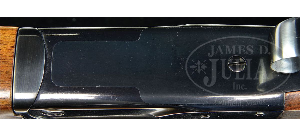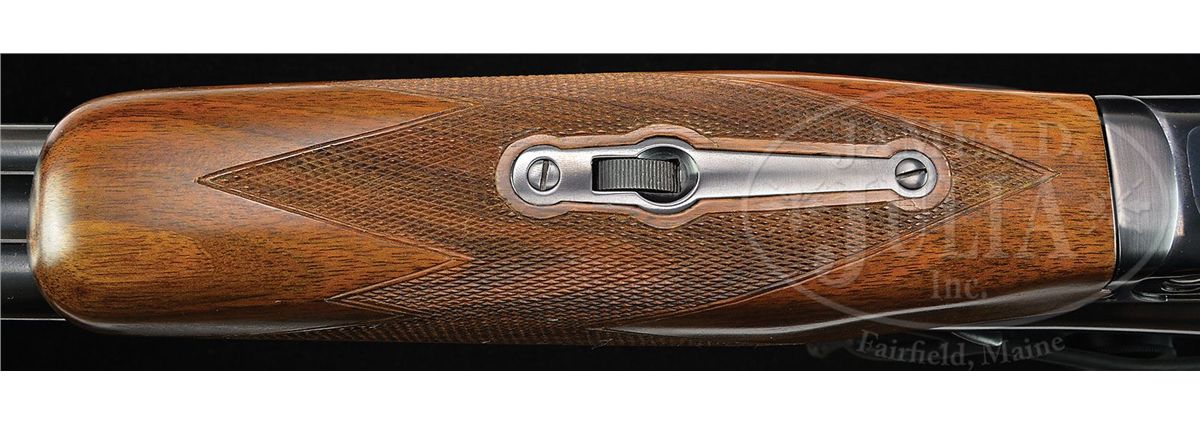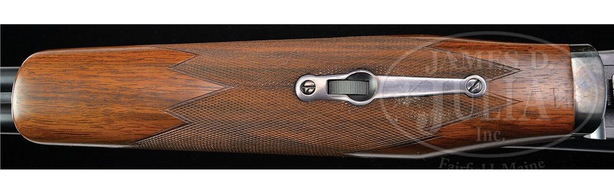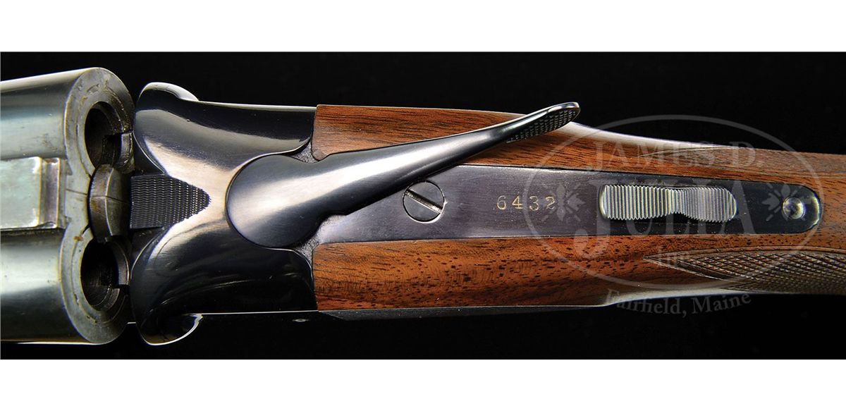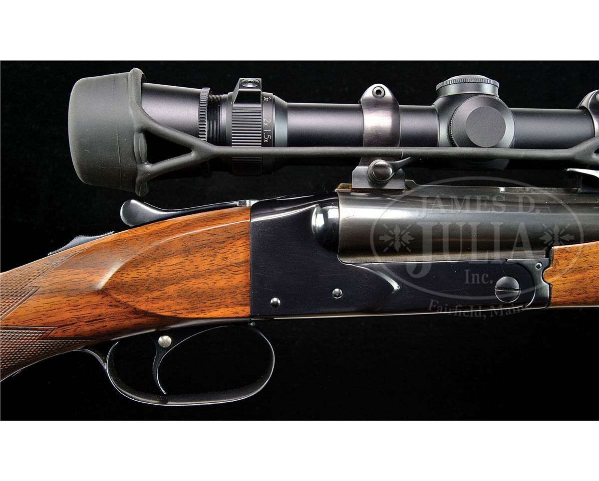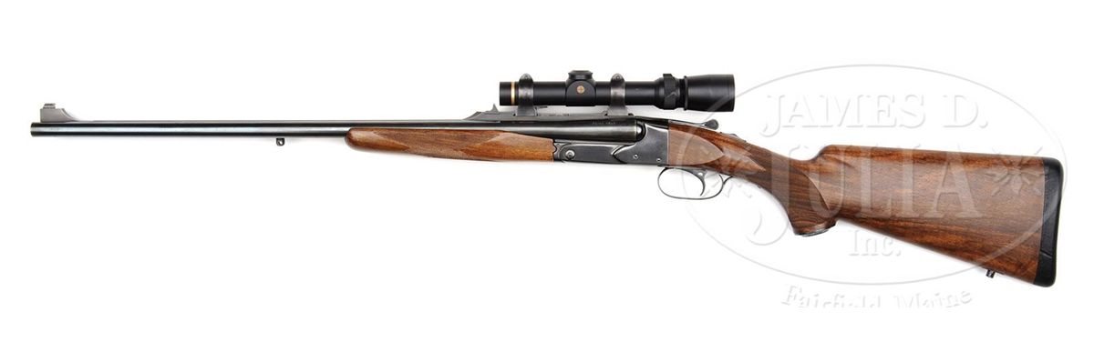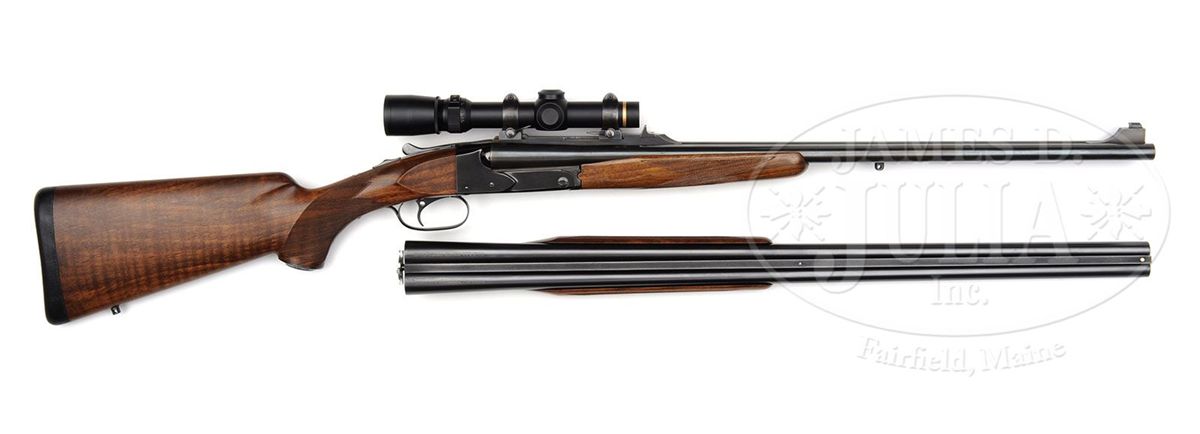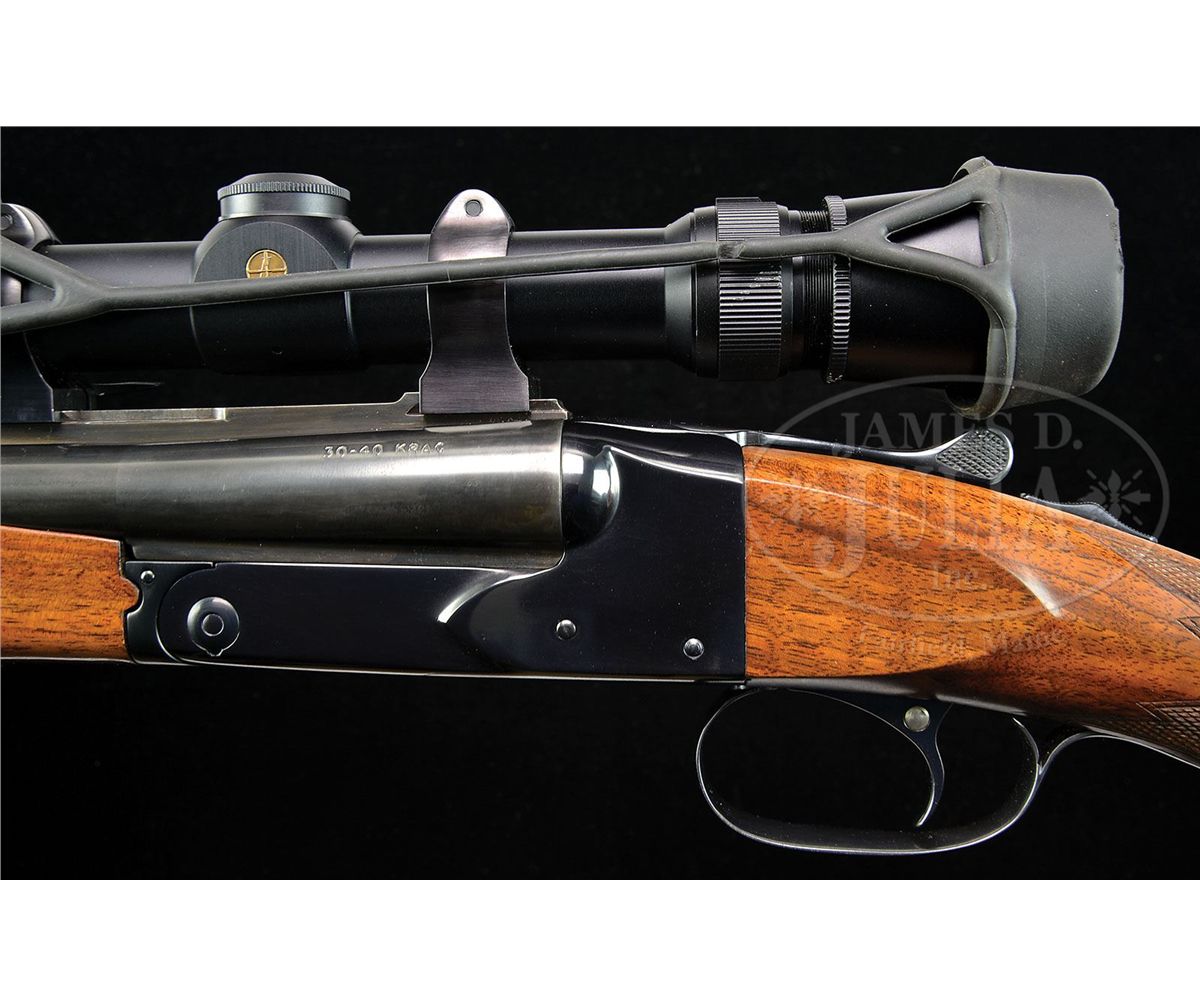 SN 6432. Cal. 20 ga. 3" Chambers and 30-40 Krag. 20 Ga. has 28" bbls fitted with Simmons ventilated rib, marked with early nomenclature on tops, additionally stamped "3 IN". 30-40 Rifle bbls are 24-1/2" mono-bloc and made by Gary Styles. They are fitted with quarter rib, mounting single standing express rear sight, and cut for dovetails accommodating Talley rings. Gold bead front sight is in tall ramp. A sling eye is screwed to bottom rib. Typical blued action has non-automatic safety and single selective trigger. Stocks are by Paul Jaeger. Full capped pistol grip buttstock is of fiddle figured and lightly marbled walnut, and measures 14-3/8" over black leather covered pad. Steel grip cap is well engraved in oak leaf pattern. At the toe there is an interesting sling eye which can be depressed and turned, locking into flush position by using a coin. Well cut point pattern checkering is at grip. A long beavertail ejector forend has reinforcing bolt. 20 ga.: Bore diameter: left-.618, right -.618. Bore restrictions: left -.004 (IC), right -.005 (IC). Wall thickness: left -.024, right -.021. Drop at heel: 1-15/16", drop at comb: 1-5/16". Weight: 7 lbs. 0 oz. LOP: 14-3/8". Rifle bbls have their own ejector small beavertail forend, and are fitted with Leupold Vari-X III 1.5 - 5 X Scope with duplex reticle in Talley QD rings. Scope has bikini storm cover. Drop at heel: approx 2", drop at comb: approx 1-3/4". Weight without scope: 10 lbs. 8 oz. LOP: 14-3/8". Accompanied by a box full of un-primed brass, RCBS dies, and re-loaded cartridges for 30-40 Krag with notebook of components used and targets. PROVENANCE: J. E. Fender collection, with his notes regarding history of this gun as he knows it, which he acquired in June 1964. Restocked in 1974, and had rifle bbls made in 1996. CONDITION: Excellent, as custom finished. Shotgun bbls retain nearly all of a satin finish, blue of rifle bbls thinning slightly. Action retains nearly all of its custom blue. Stocks have a number of light marks and scratches in their oil finish. Bores are excellent. Action is tight with both sets of bbls. Mechanics are excellent. Scope is excellent. Ammo is very fine. 4-48896 MGM168