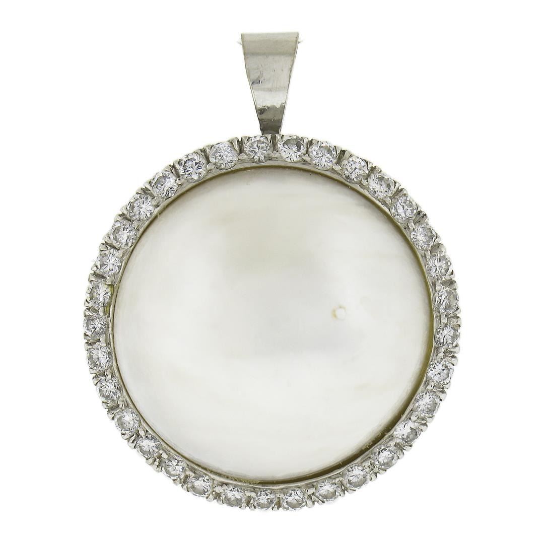 A pearl strand necklace with 14k white gold clasp. featuring 34 GIA graded near round cultured pearls (11.27-14.89mm), 1 round shape cultured mabe pearl (19.6mm), surrounded with a halo of round cut natural diamonds (G-I - VS2/SI1 ; 0.75ctw). 20 inch pearl link chain, 122.10 grams total weight, pendant measures 23.9mm in diameter. Comes with all original relevant certifications.