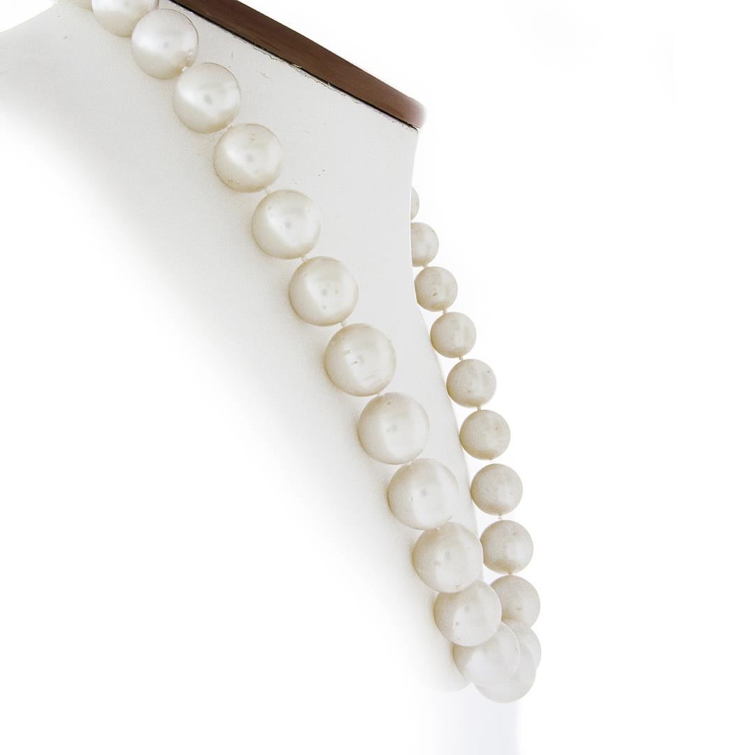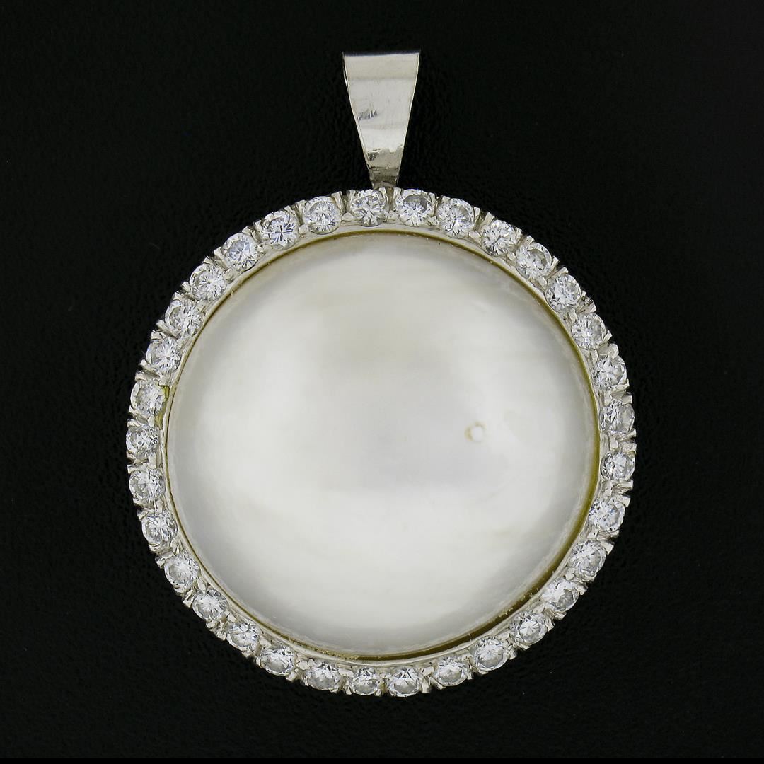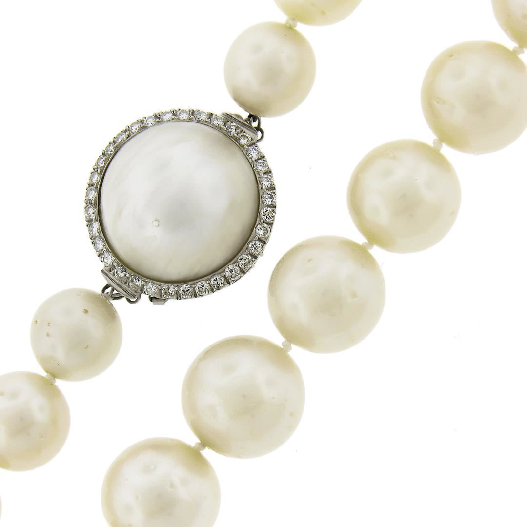 A pearl strand necklace with 14k white gold clasp. featuring 34 GIA graded near round cultured pearls (11.27-14.89mm), 1 round shape cultured mabe pearl (19.6mm), surrounded with a halo of round cut natural diamonds (G-I - VS2/SI1 ; 0.75ctw). 20 inch pearl link chain, 122.10 grams total weight, pendant measures 23.9mm in diameter. Comes with all original relevant certifications.