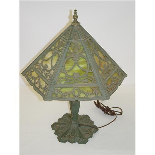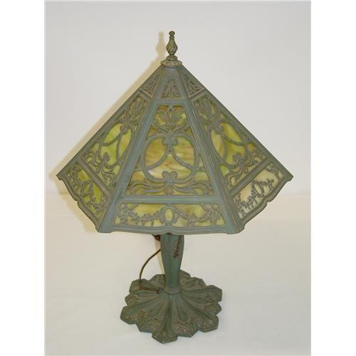 20" GREEN SLAG GLASS TABLE LAMP - GREEN PATINATED BASE W/ FLORAL DECORATION W/ 15 1/2" GREEN SLAG GLASS 5-PANEL SHADE W/ GREEN PATINATED FILIGREE OF GARLAND & STYLIZED FLOWERS-UNMARKED - REPLACED OLD FINIAL, WEAR & MINOR IMPERFECTIONS;