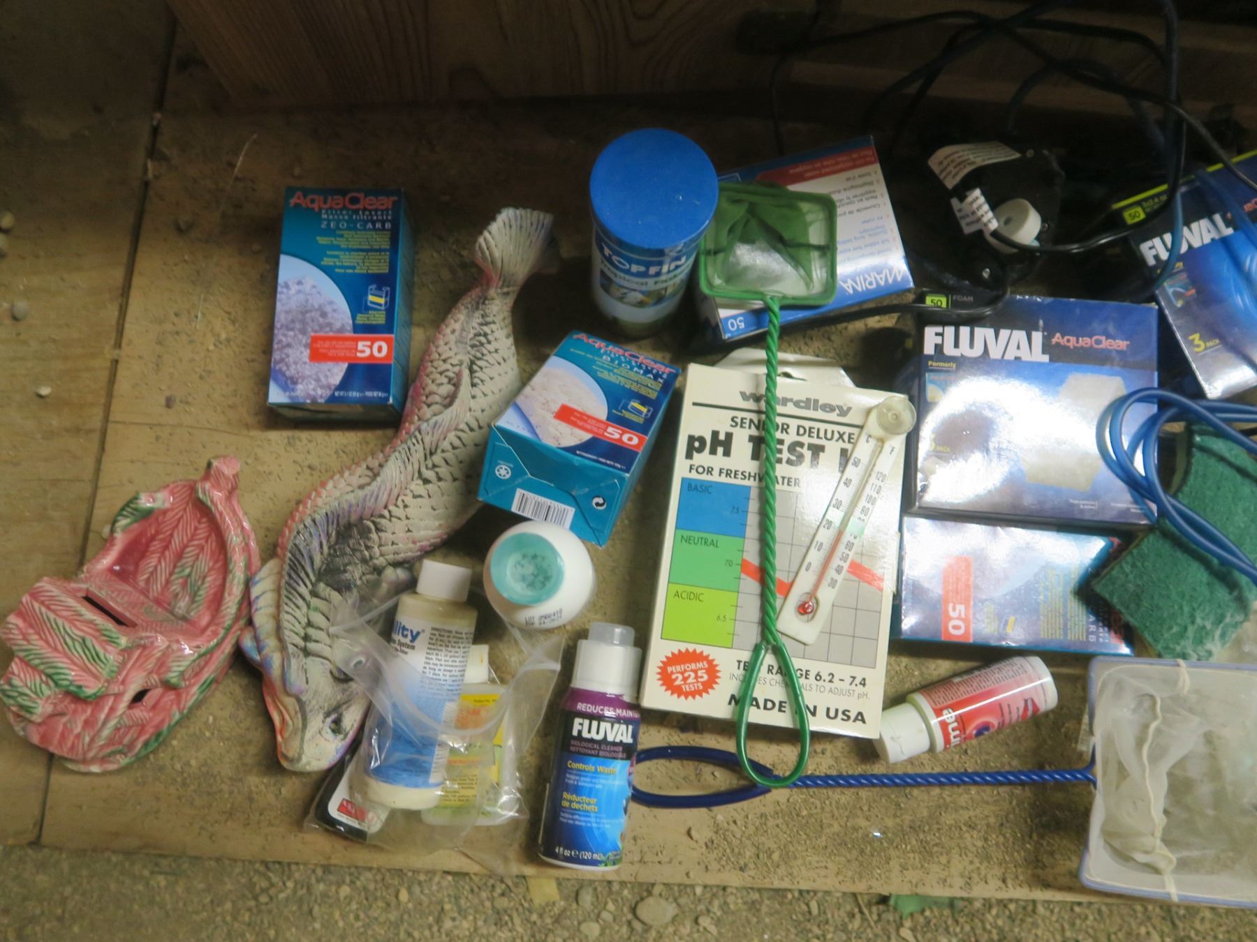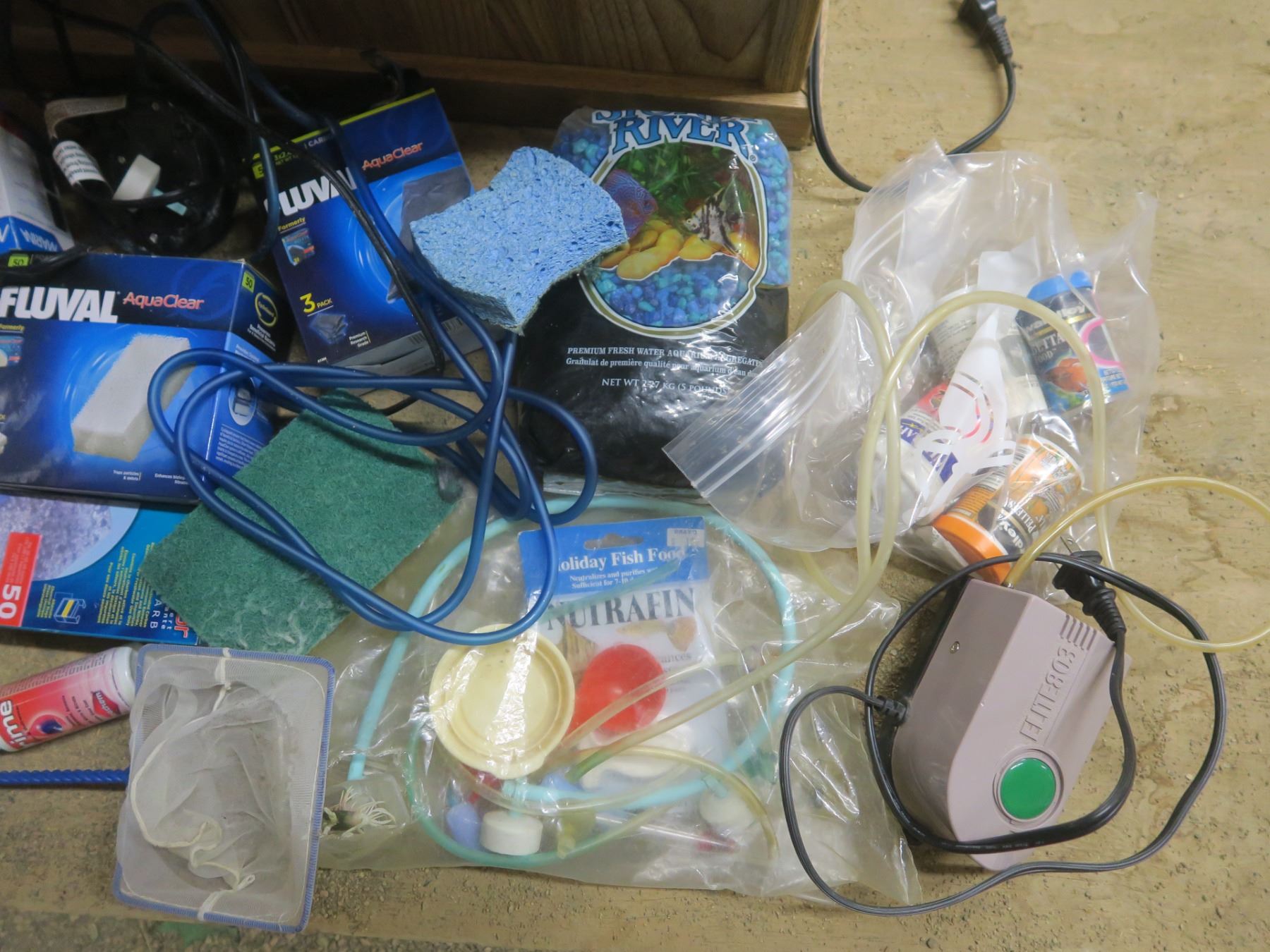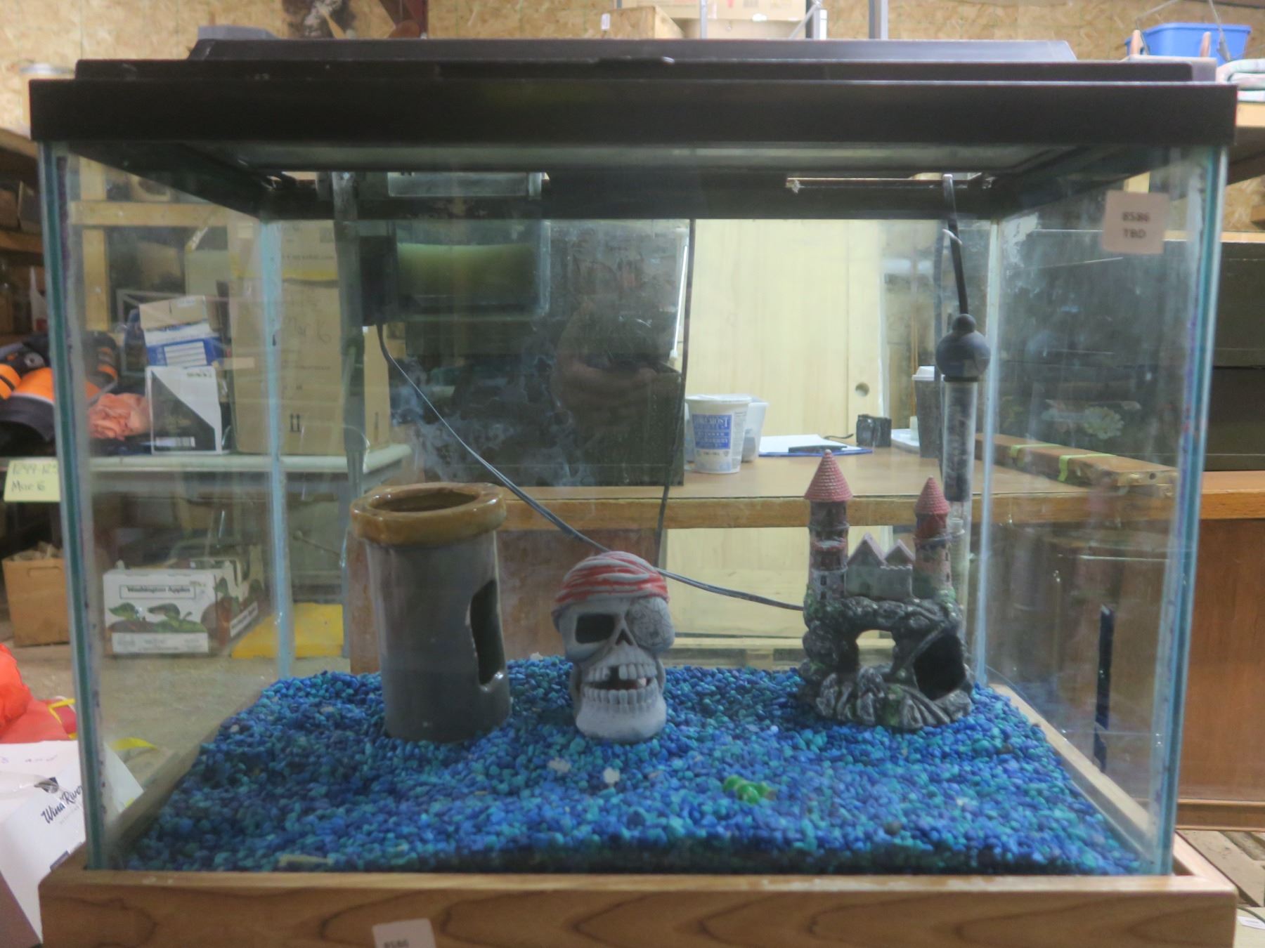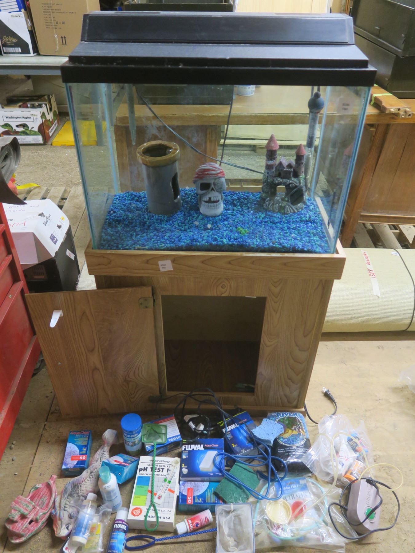 20 Gallon Fish Tank (comes with cabinet, accessories, tank heater, assortment of tank filters, fish food and bag of tank aggregate