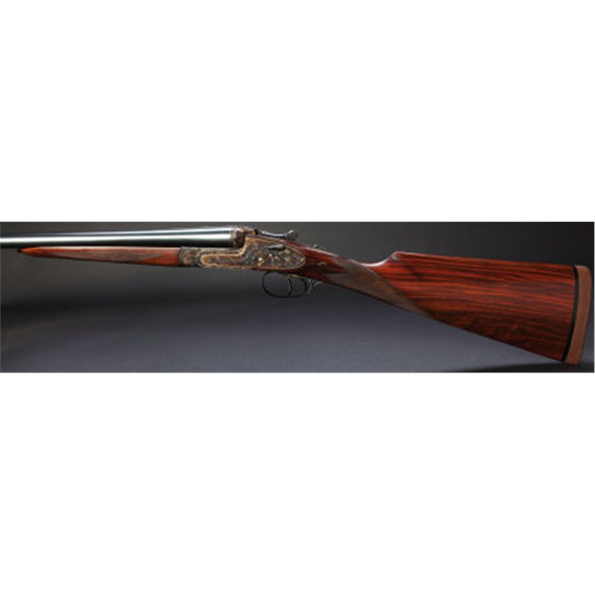 **20 Gauge AYA Number 2 Sidelock Ejector Double Barrel Shotgun. Serial no. 151327. 20 Gauge. 27 1/2 inch barrels with game rib. Casehardened action with bar action with 8 pin locks. Action and locks engraved with foliate scroll. Hidden third fastener. Ejectors. Cocking indicators. Disc set strikers. Automatic safety. Hand detachable locks. Hinged front trigger. Maker's crest on top lever in gold. Beaded triggerguard. Finely checkered straight grip stock of contrasting straight grain dark walnut. Later one-inch thick recoil pad. Finely checkered splinter fore-end with Anson-style release. Data: Barrel Dimensions: Bores: 0.622/0.622 inches. Chokes: 0.017/0.040 inches (Modified/Full). Chambers: 2 3/4 inches. Minimum wall thickness: 0.022 inches. Proof: Spanish Nitro, 15.8, 15.8, 20/70. Stock Dimensions: Pull: 14 3/4 inches. Drop at comb: 1 3/8 inches. Drop at heel: 2 1/8 inches. Cast-off: 1/8 inches. Weight: 6 pounds, 2 ounces. Condition: Excellent, showing limited use. Barrels and furniture show 99% bluing. Excellent bright bores. Action and locks show 99% vivid case colors. Stock shows a few very light handling marks. Fore-end shows a one-inch long professional repair to the edge.